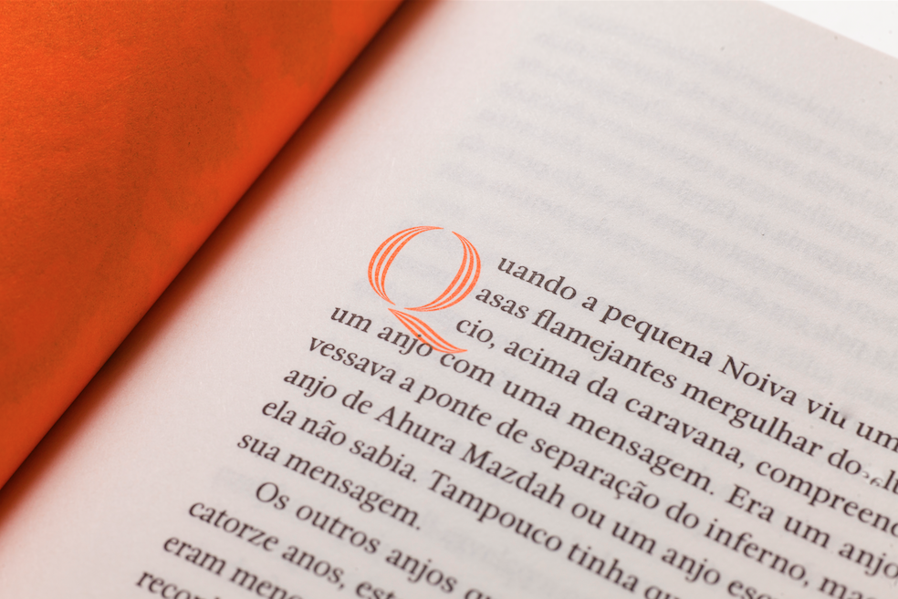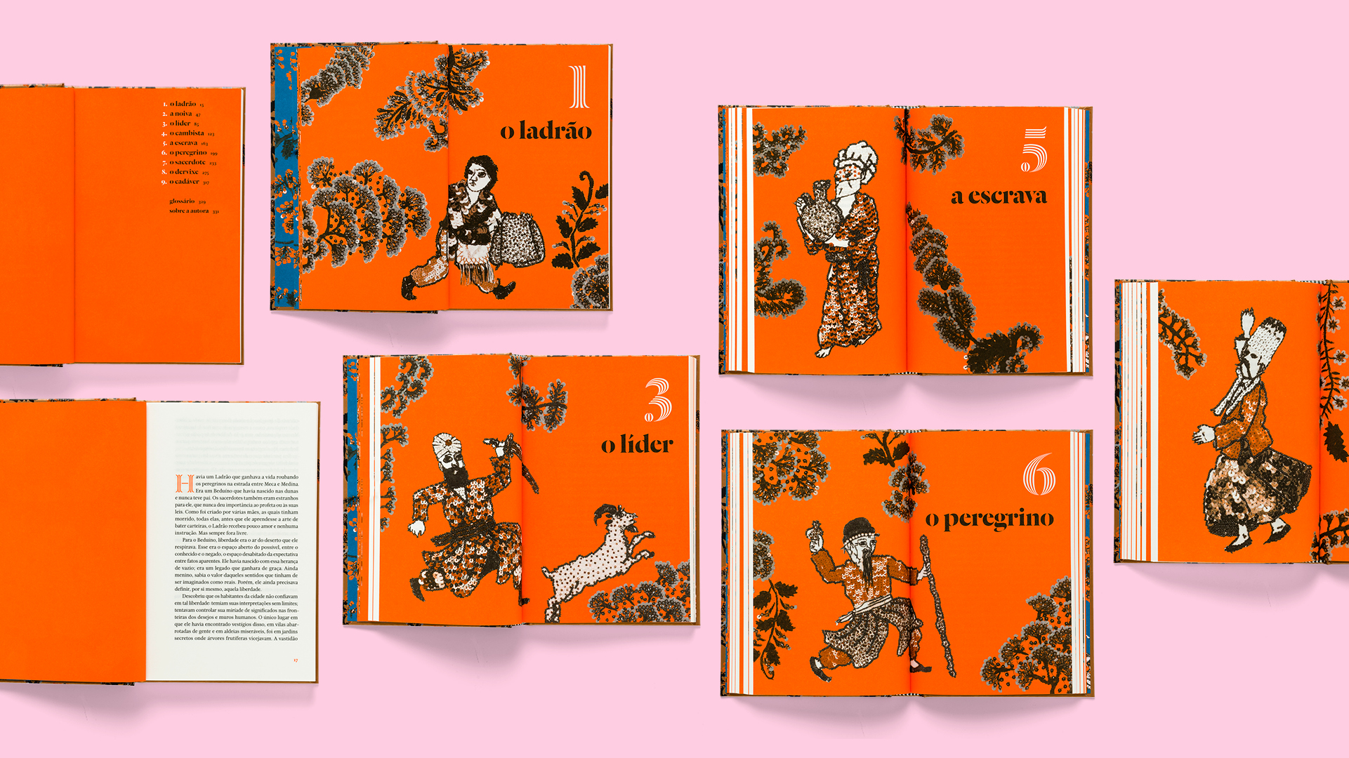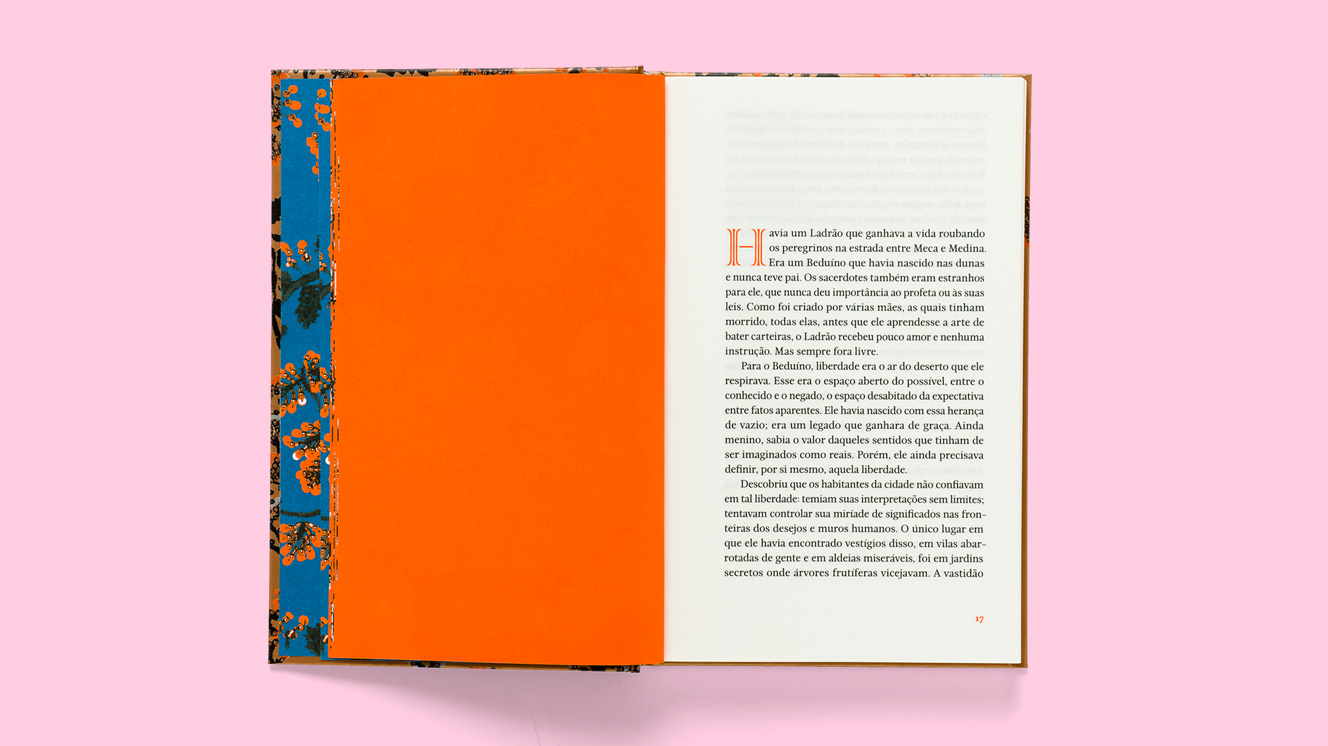 The task to choose a typeface that could go along the richly detailed illustrations was not simple — I didn’t want to make any obvious reference to Arab lettering. The title of the book combines layers of Dala Floda and Dala Prisma, which is also used for chapters and drop caps (in Pantone 021) inside the book. The interior is set in Nyte by Portuguese type designer Dino dos Santos.