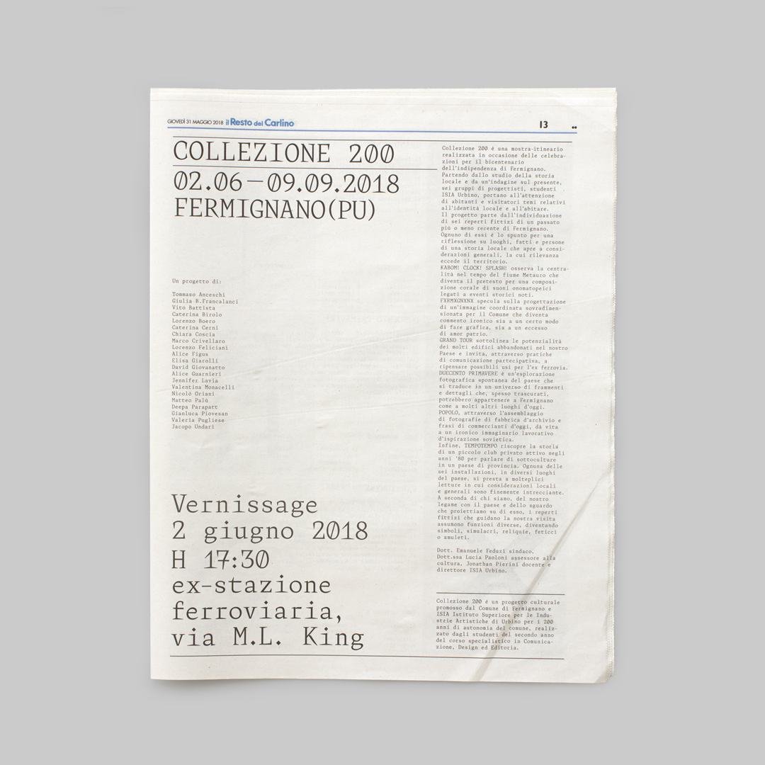 COLLEZIONE 200 is an exhibition/itinerary created on the occasion of the celebrations for the bicentennial of the independence of Fermignano.
