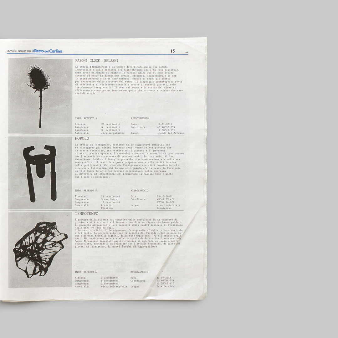 The project was born from the identification of six fictitious finds of a more or less recent past of Fermignano. Each of them is the starting point for a reflection on places, facts and people of a local history that opens to general considerations, whose relevance exceeds the territory.