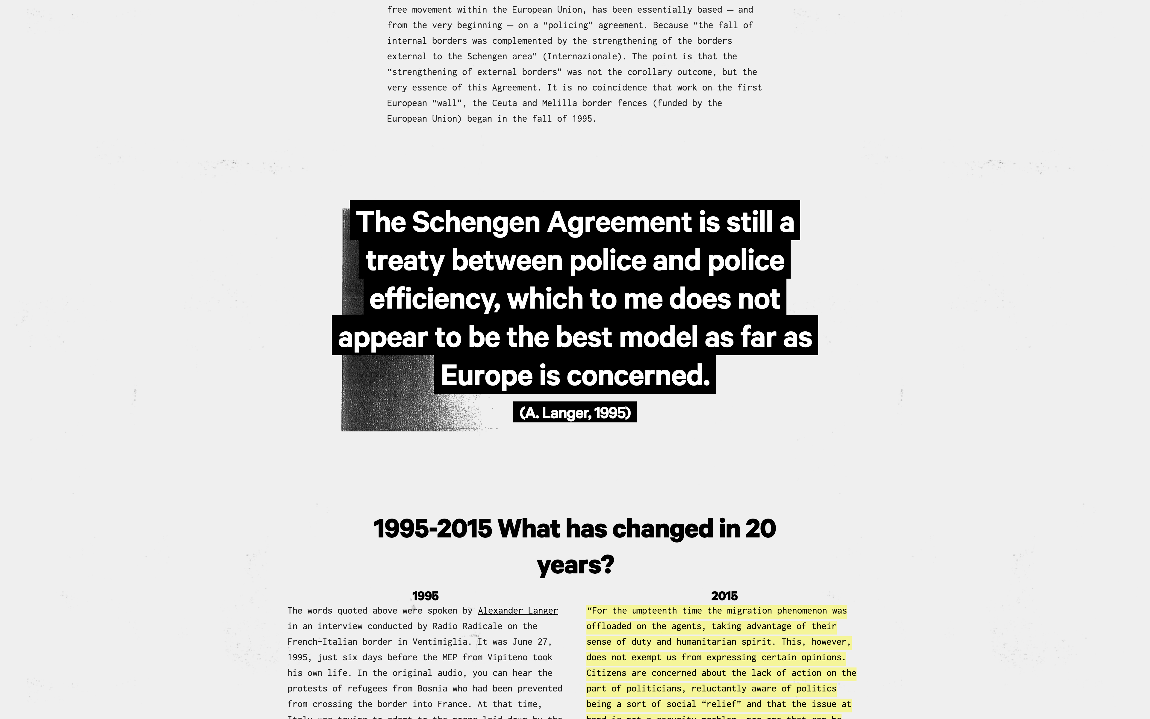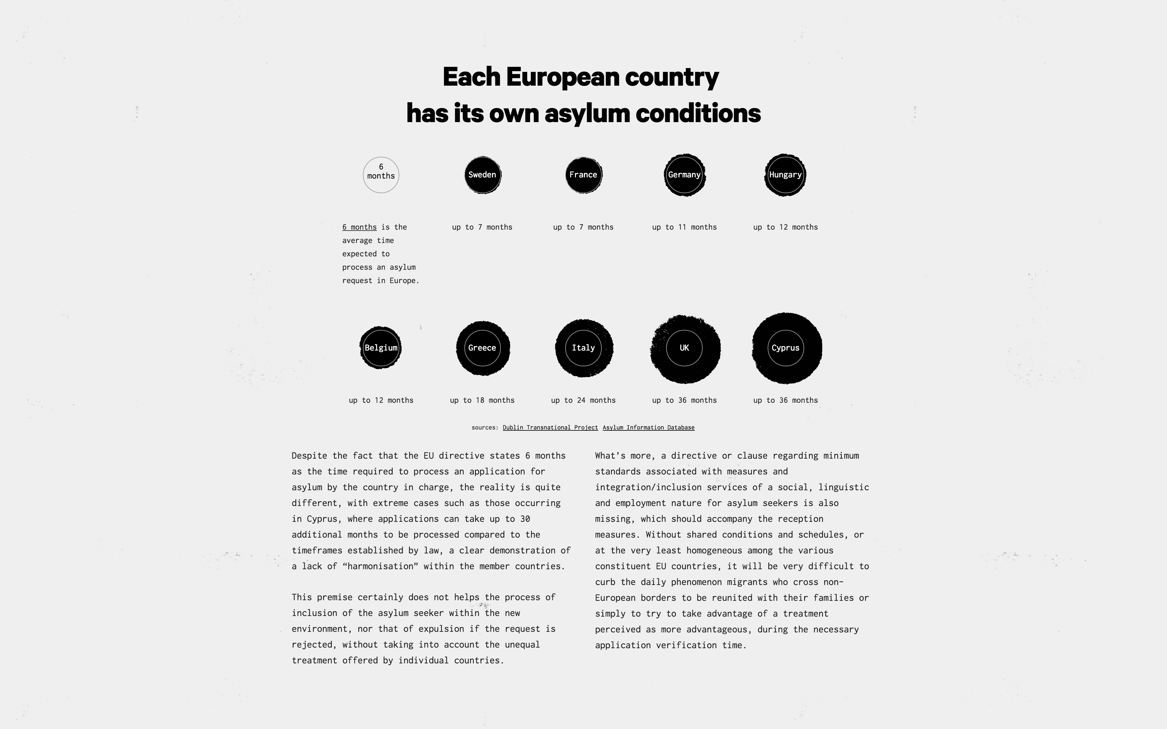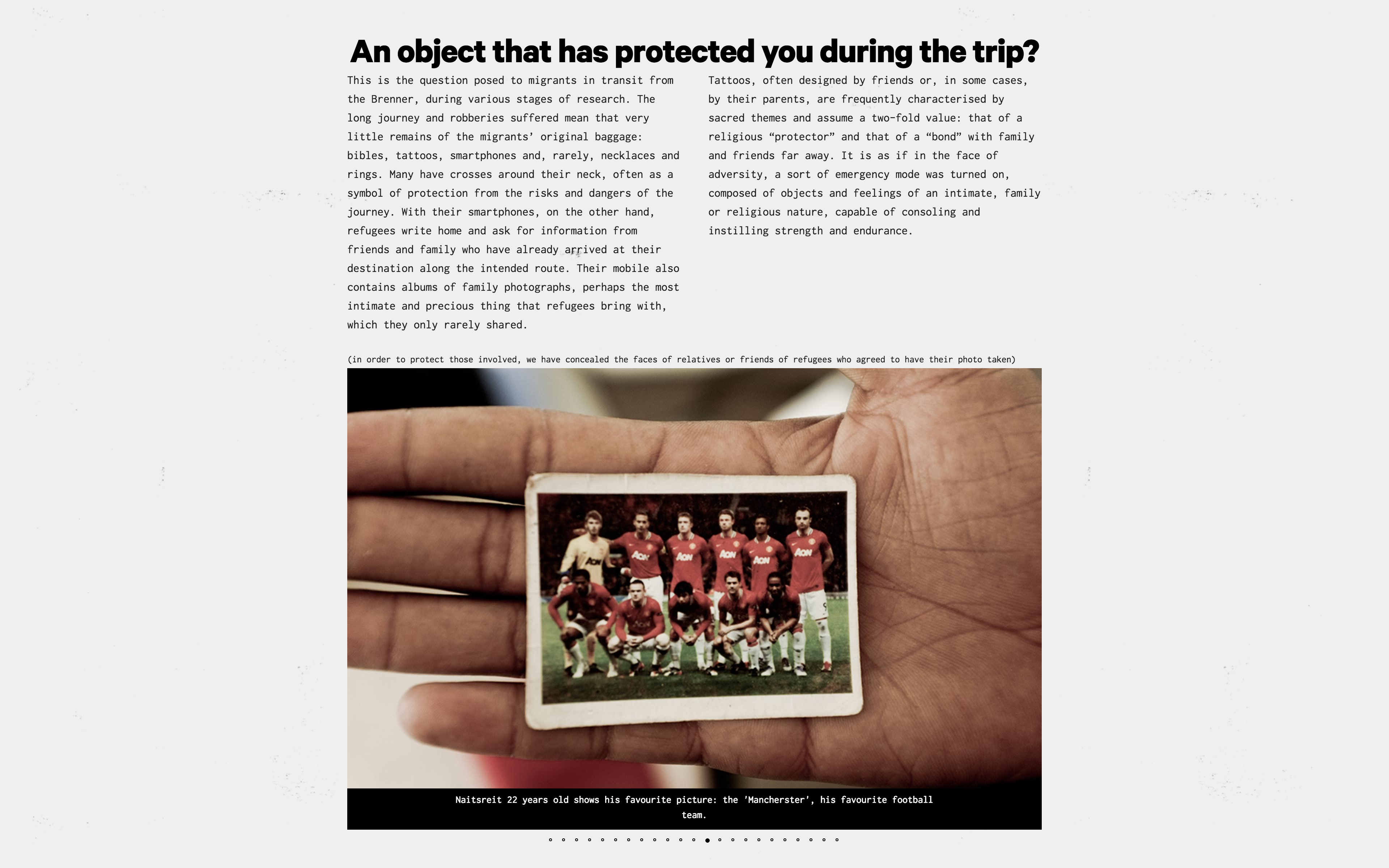 Europa Dreaming is a visual journalism project. It features Calibre Bold and Inconsolata on a greyish design that aims to evoke the consumed documents and photocopies migrants often bring themselves, with useful information, hand-drawn maps and memories. At the same time, the design reconnects with black and white newspapers that are the core of the archive research at the base of the project.