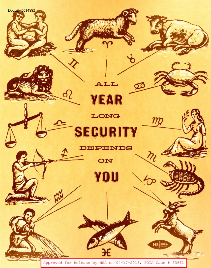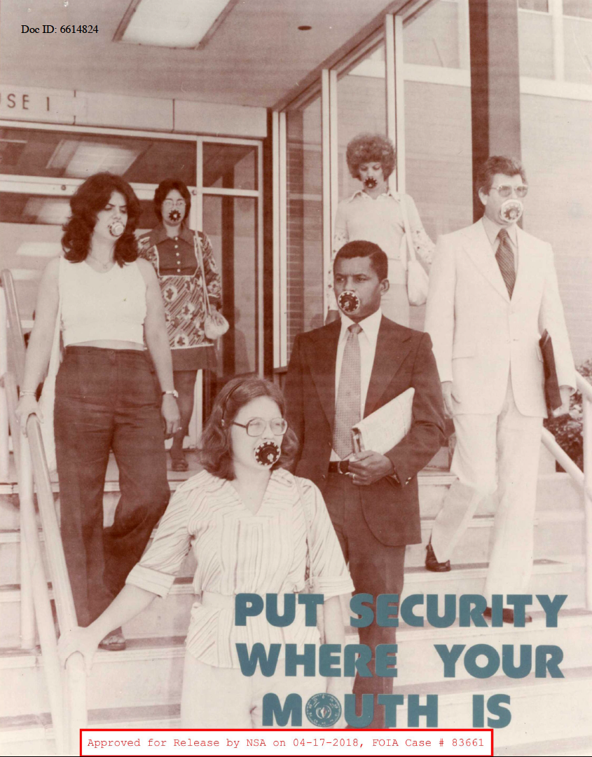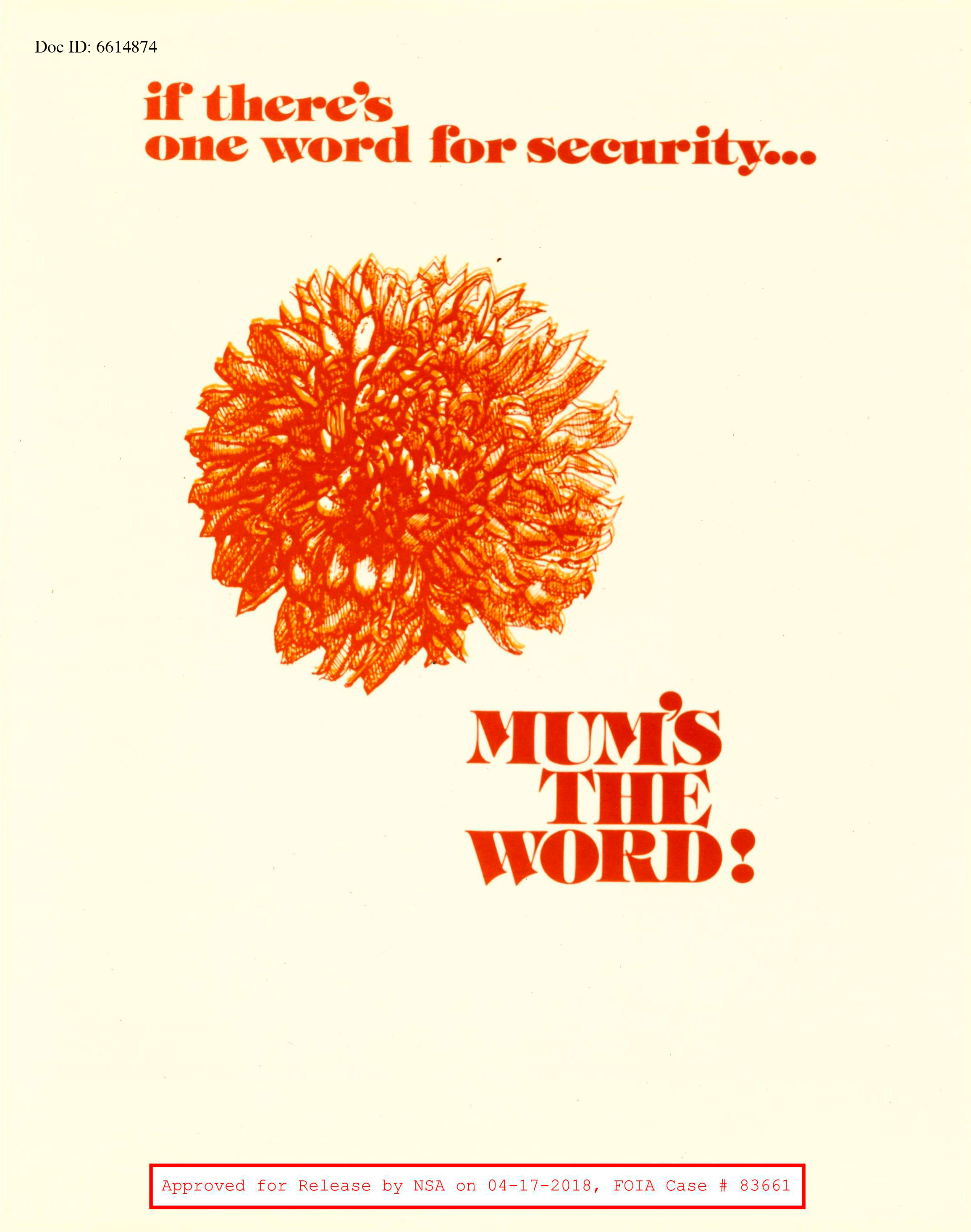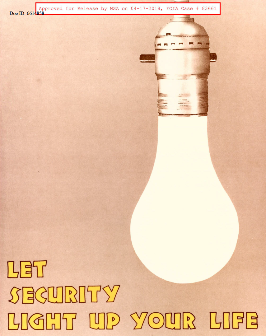 These posters were intended to motivate and remind personnel of the National Security Agency (NSA) to work safe, secure and discrete. The sample comprises 136 posters from the collection (pdf). Although the accompanying statement mentions that they stem “from the 1950s and 1960s”, there are several that must be younger, as they are set with fonts released in the 1970s. The individual posters are not dated, but many are numbered.