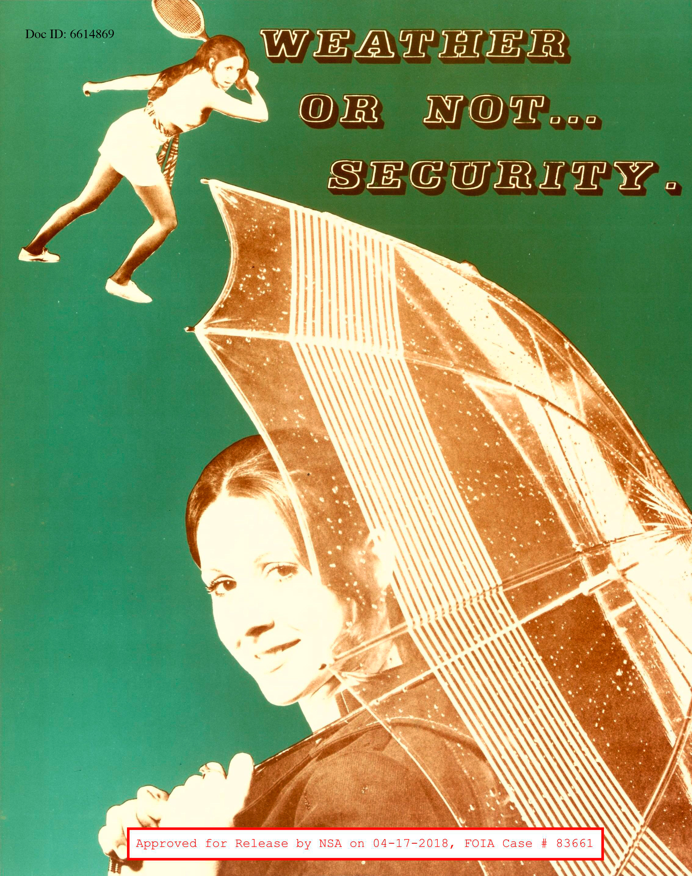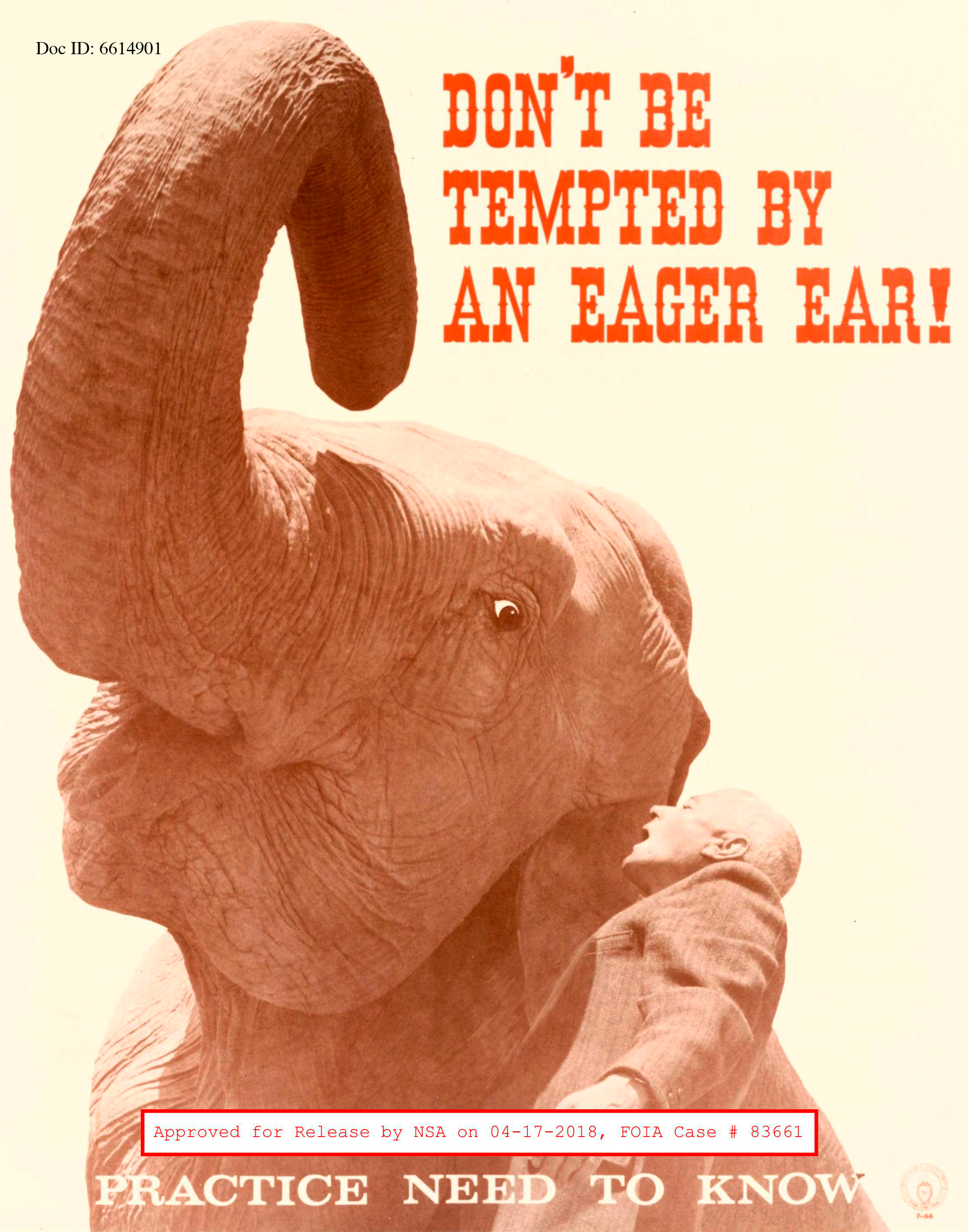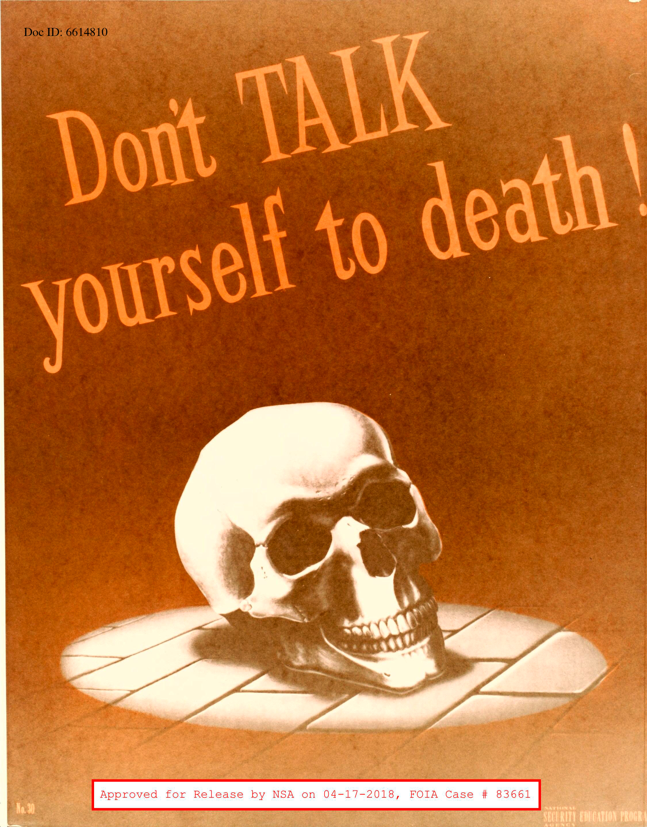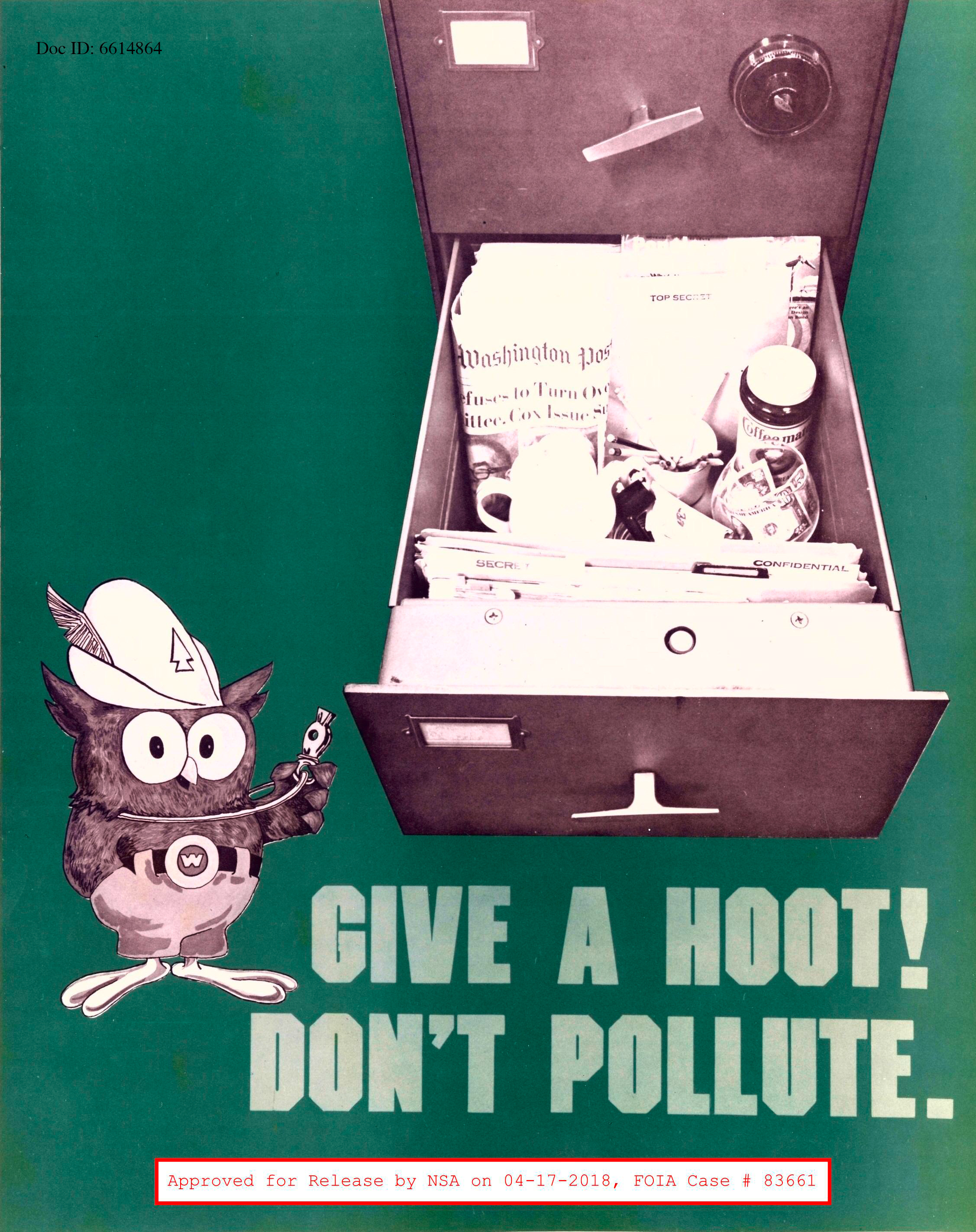 These posters were intended to motivate and remind personnel of the National Security Agency (NSA) to work safe, secure and discrete. The sample comprises 136 posters from the collection (pdf). Although the accompanying statement mentions that they stem “from the 1950s and 1960s”, there are several that must be younger, as they are set with fonts released in the 1970s. The individual posters are not dated, but many are numbered.
