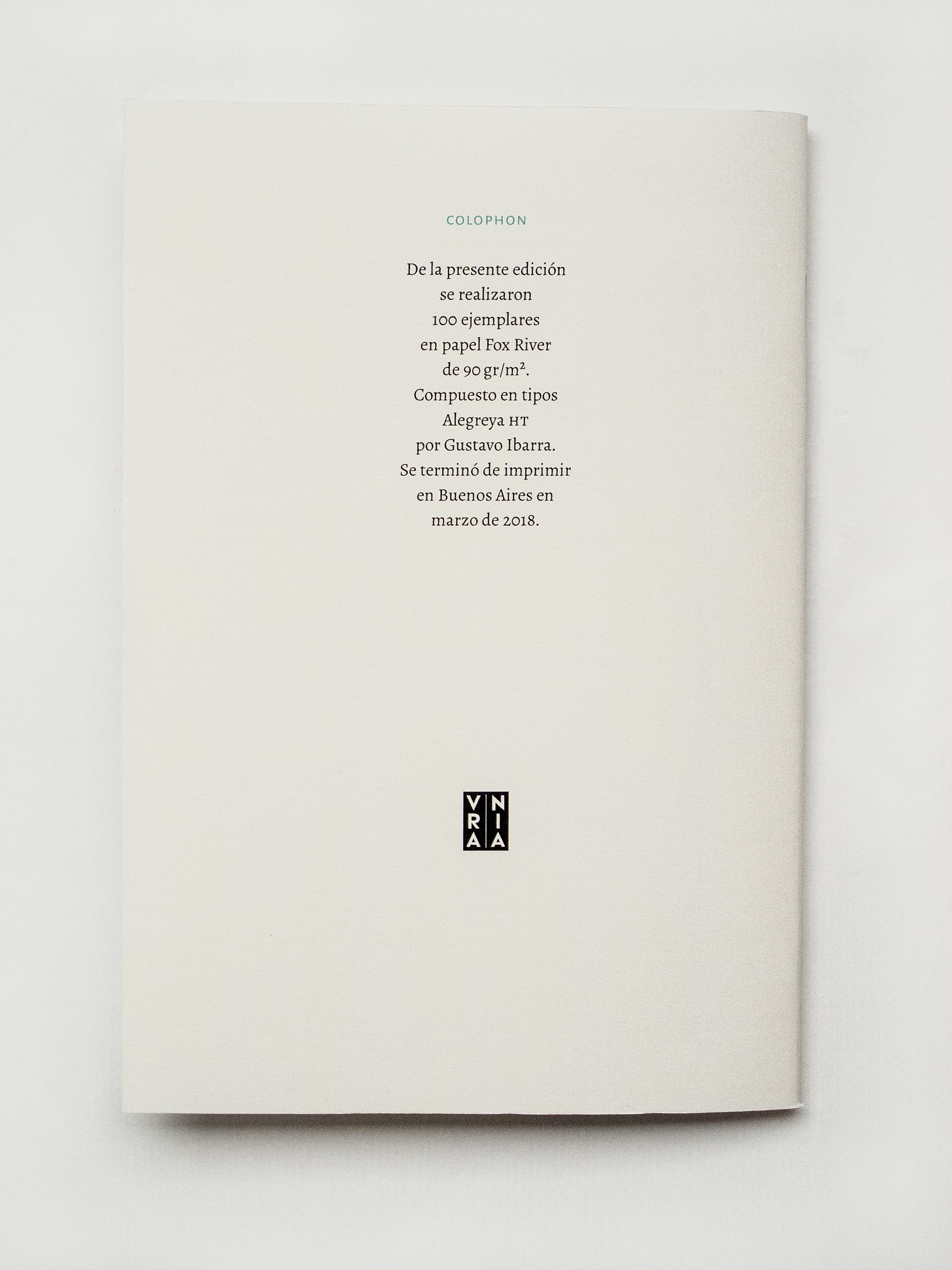 The book was printed in an edition of 100 copies on 90g Fox River paper. It has 40 pages and measures 14×20 cm. Edited by Ral Veroni, the typographic composition was provided by Gustavo Ibarra using the Alegreya HT typeface family.
