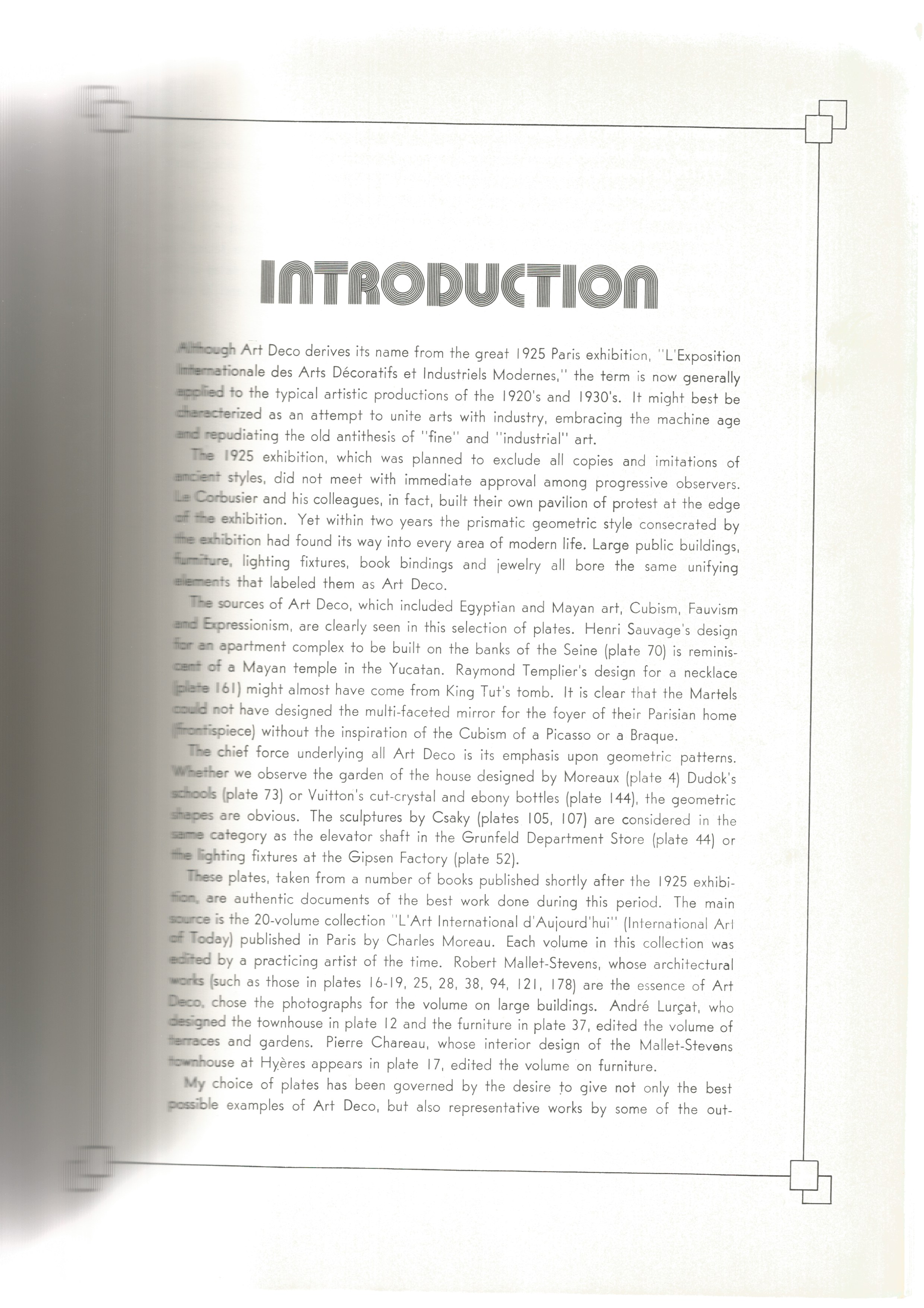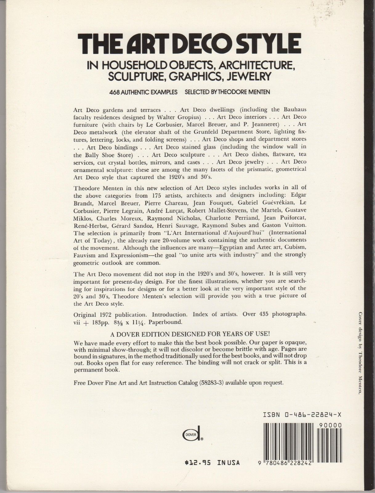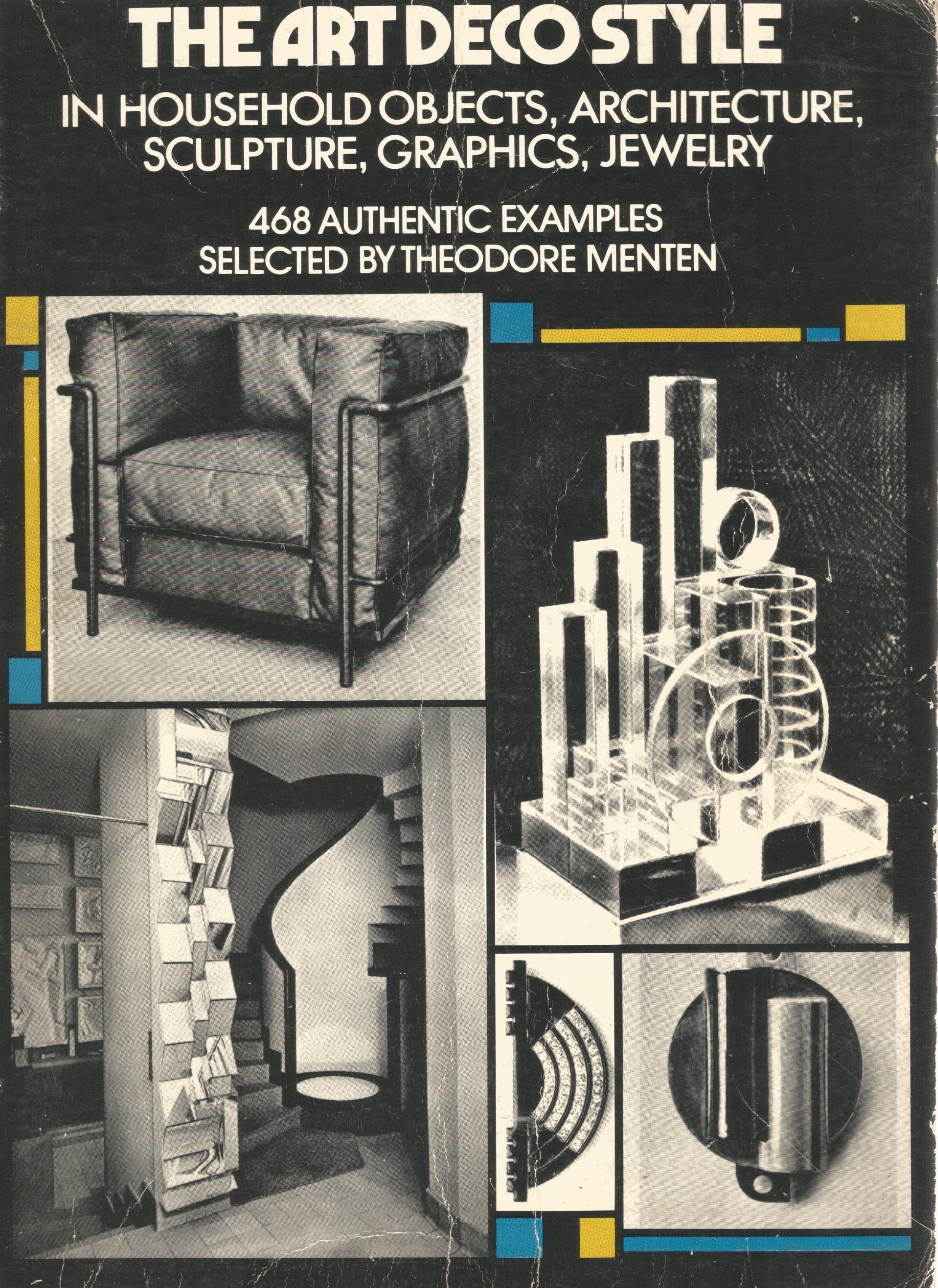 The Art Deco Style in Household Objects, Architecture, Sculpture, Graphics, Jewelry : 468 Authentic Examples Selected By Theodore Menten is a book on Art Deco which shows examples through design, posters and architecture. Collected and edited by Theodore Menten, who also deigned the book cover. Paperback, published with Dover Architecture, 1972.