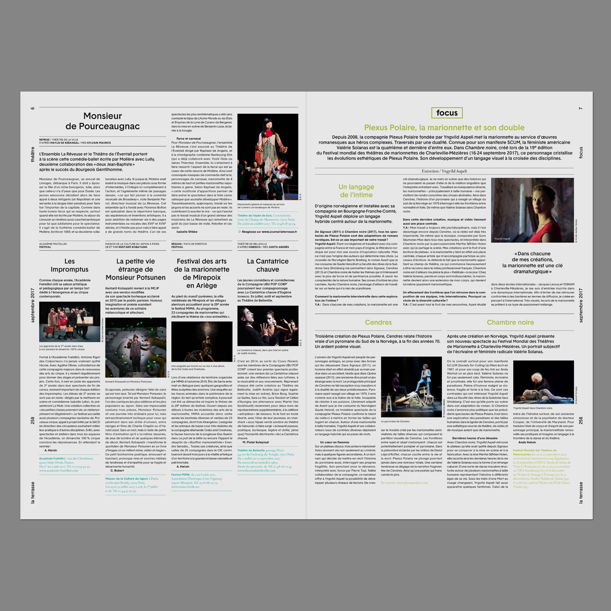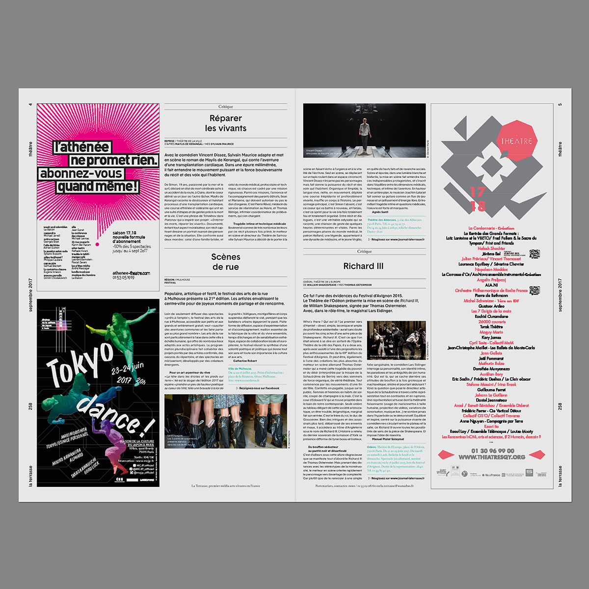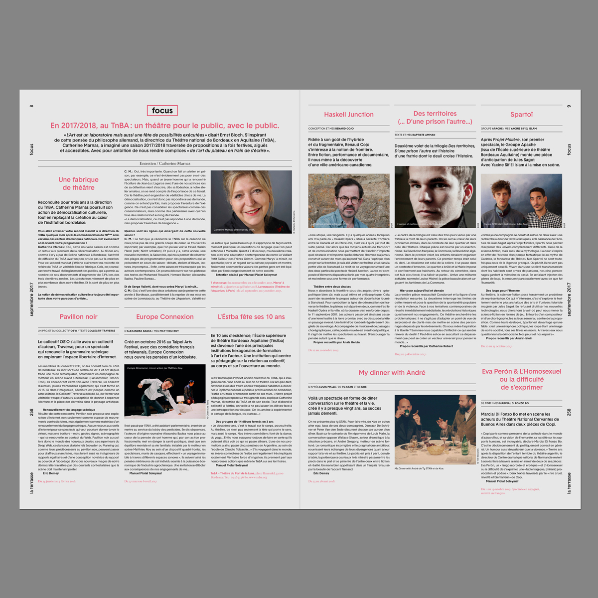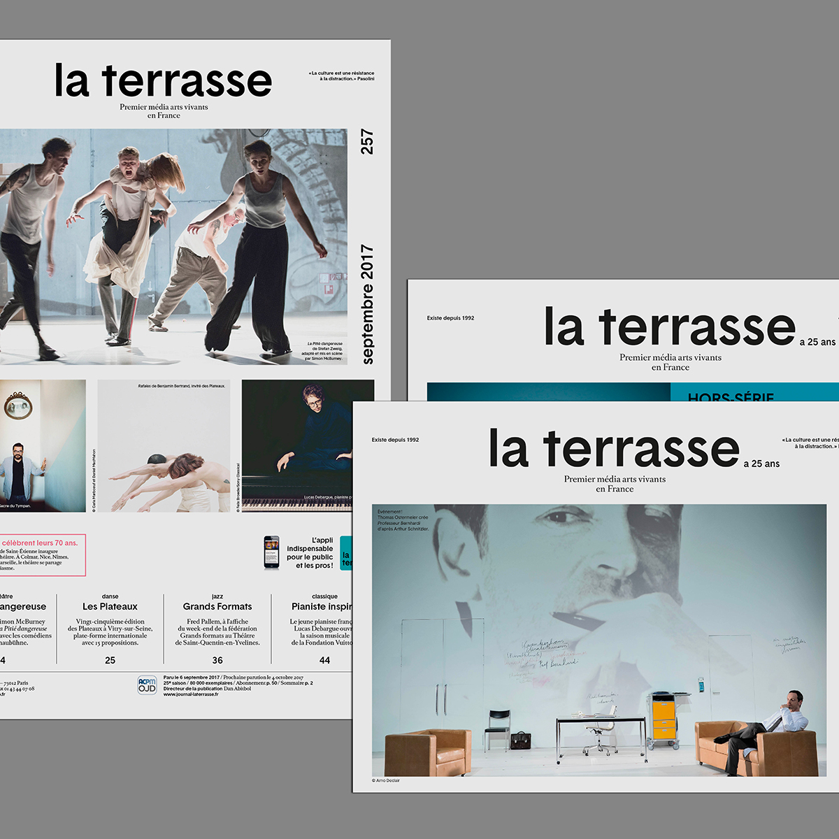 Aurore Chassé has been artistic director of La Terrasse since September 2017. She designed the model with the typeface Basetica (205TF), created by Matthieu Cortat. Basetica is paired with Romain (Swiss Typefaces). The only one of its kind, La Terrasse, a free monthly created in 1992 by Dan Abitbol, covers the theatrical, choreographic and musical news of the Paris region and highlights the living spectacle of quality in all its diversity.