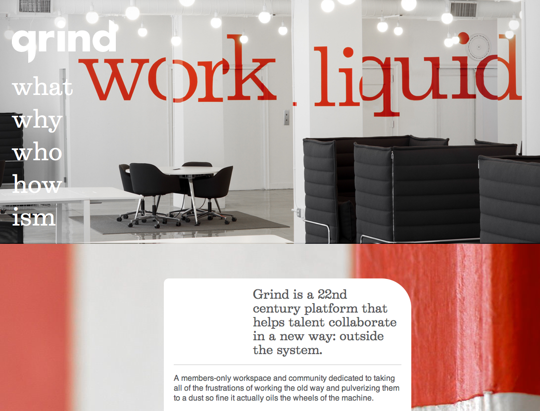 Grind is a members-only shared workspace and community in New York City. The website uses Belizio as a webfont via Webtype, combined with standard Arial, which looks almost sophisticated next to the stylish slab-serif. The overall nice design and color scheme also helps of course.