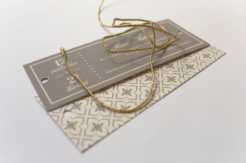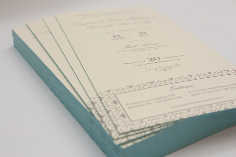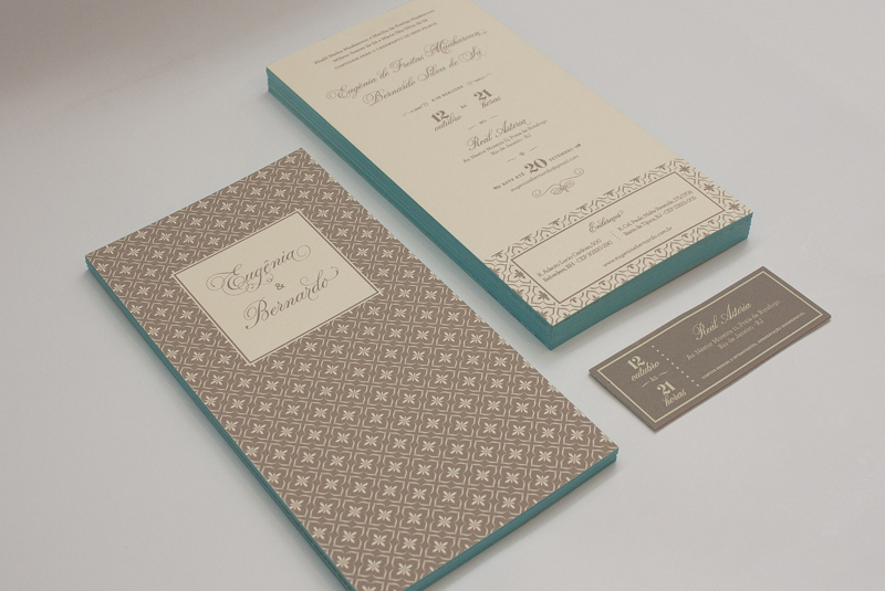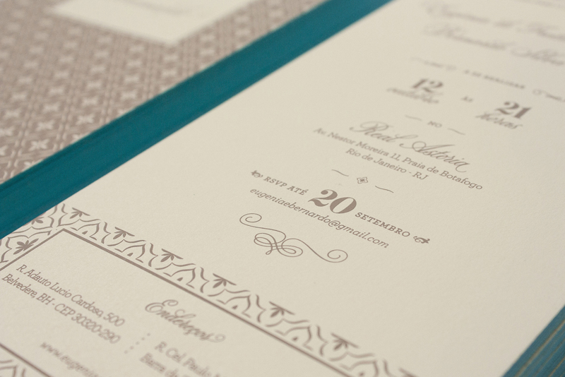 The mixing of a traditional script like Parfumerie with cute/modern Archer and F37 Bella Numerals was used to reflect the same vibrancy and contrast as the patterns and colors. Cool features included a blue printed boarder and attached mini invitations for the reception.