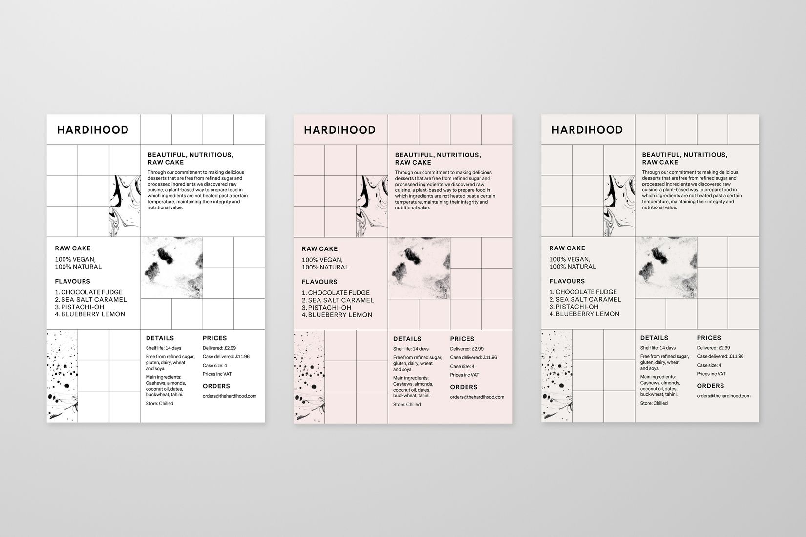 It felt right that the visual identity should reflect the cakes themselves. The contrast of clean, straight geometric forms together with natural and flowing textures. This to us was the key to the Hardihood’s aesthetic and tone.