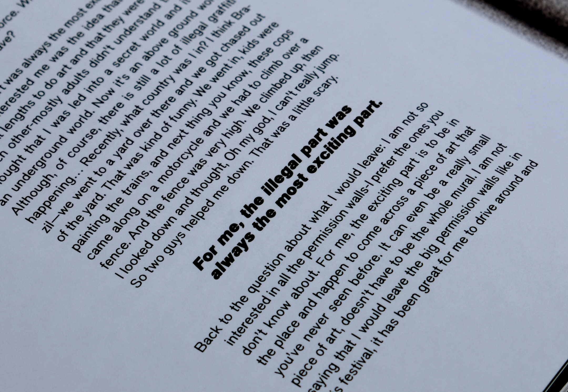 Blackout exhibition publication Contributed by Soo Kim on Jun 22nd, 2018. Artwork published in 2017. Photo: Soo Kim. License: All Rights Reserved. A publication for Blackout, a fictional exhibition that would celebrate and commemorate the 30 year anniversary of the birth of Hip-Hop culture after the Blackout of New York City in 1977. Photo: Soo Kim. License: All Rights Reserved. Photo: Soo Kim. License: All Rights Reserved. Photo: Soo Kim. License: All Rights Reserved. Photo: Soo Kim. License: All Rights Reserved. Photo: Soo Kim. License: All Rights Reserved. Typefaces More about EurostileGet EurostileMore about Akzidenz-GroteskGet Akzidenz-Grotesk Formats Books (6658) Topics Lifestyle (1454) Music (6454) Designers/Agencies Soo Kim (1) Tagged withfictional (252)exhibition catalogs (873)hip-hop/rap (250)New York City (108)US history (70)black on black (36)spot varnish (93) Artwork location United States (10066) Los Angeles (573) In SetsEurostile (Margo Da) (13)Title (Byeong Man Kim) (52) Post a comment Name Email – will not be published Website Your response Submit Comment More Eurostile in use Body stickersc. 1972unknownContributed by Florian Hardwig Fronesis magazine (1998–)1998Contributed by Love Lagerkvist Outer Limit Lotus – Dazzling Darkness album art, single covers, collateral2023Henrik MyrvoldContributed by David Jonathan Ross Staff Pick Sponsor More in Lifestyle Pioneer Works Broadcast, Death Week series2025Pioneer WorksContributed by Sharp Type Staff Pick Sporthotel Lorünser2025TeelContributed by Pangram Pangram Sunday's Amsterdam2014Photo(s) by Henk Gianotten on Flickr. GQ Dec. 2010 “Men of the Year” covers2010Contributed by Font Bureau More in Books CLAP! Contemporary Latin American Photobooks2017Ricardo BáezContributed by PampaType Team Staff Pick Lesbar – Typografie in der Wissensvermittlung2019Rudolf Paulus GorbachContributed by TypeMates Seymour Chwast: The Left-Handed Designer1985Seymour ChwastContributed by Stephen Coles Dans la nuit by E.T.A. Hoffmann2022unknownContributed by Hrvoje Živčić More Fonts In Use Georg Hartmann anniversary publication1947Gudrun Zapf von HesseContributed by Ferdinand Ulrich Staff Pick CCEBA – Centro Cultural de España En Buenos Airesc. 2004Bernado + CelisContributed by Gareth Hague Staff Pick Wolfra Alpenschorle packaging2020Zeichen & WunderContributed by TypeMates Staff Pick Liebe zum Ort – Zukunftsgerechte Städte by Joël Luc Cachelinc. 2024Büro SequenzContributed by HAL Typefaces Staff Pick
