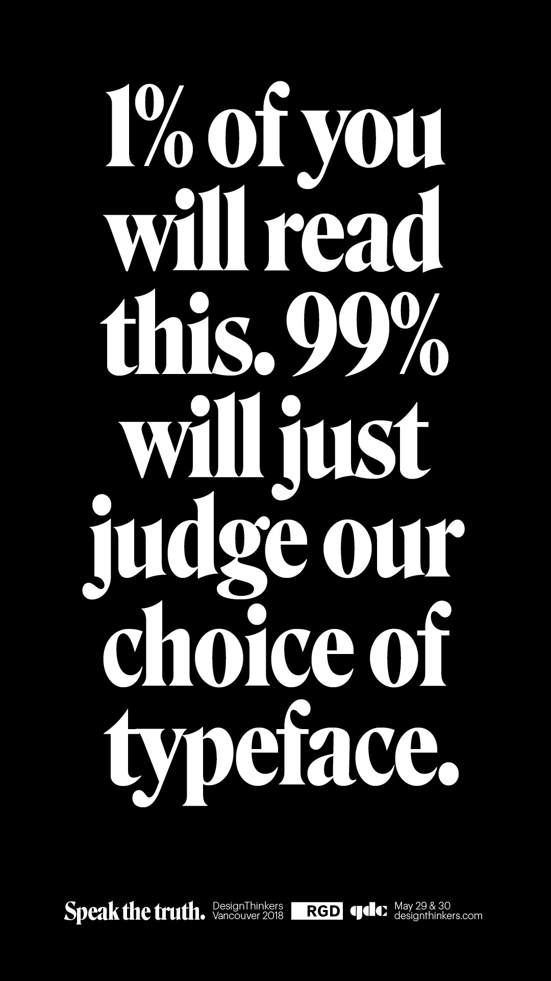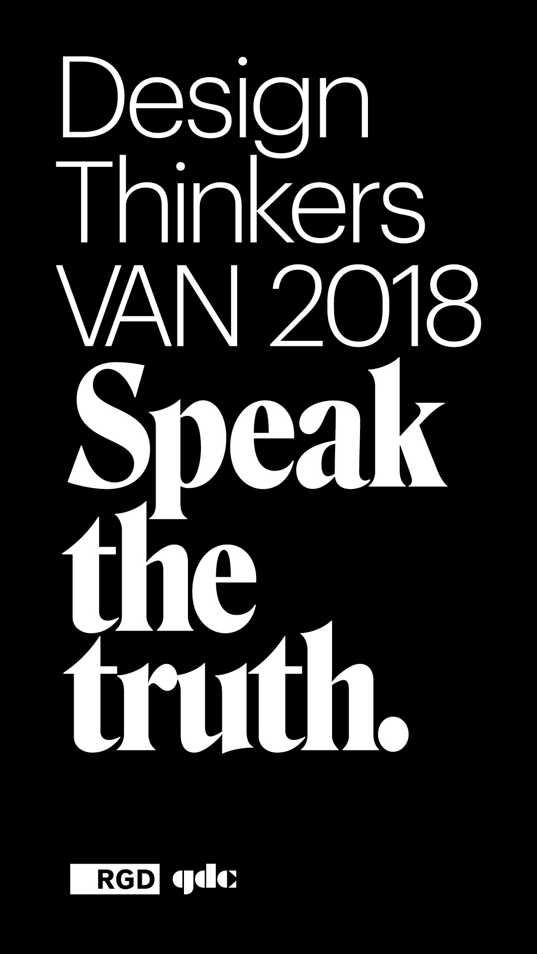 DesignThinkers is a conference put on each year by the RGD (Association of Registered Graphic Designers) in Canada. For the 2018 conference in Vancouver, Zulu Alpha Kilo put together a type-centered, no-nonsense identity tied to this year’s theme, “Speak the Truth.”