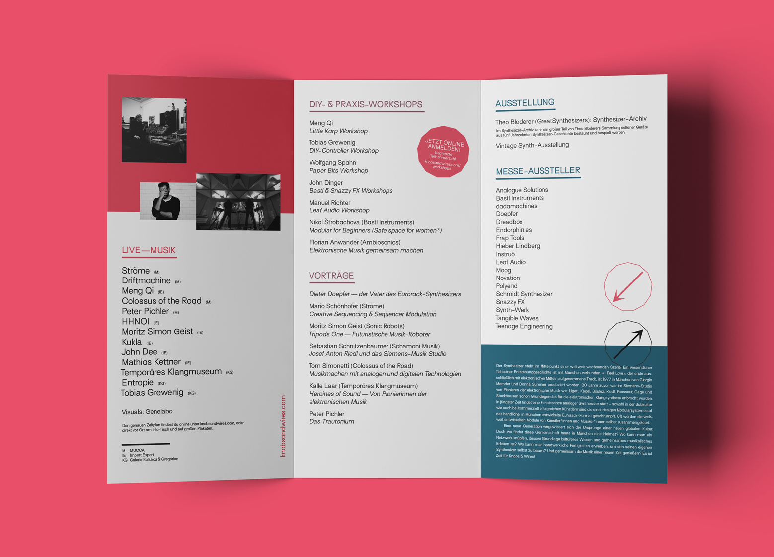 Logo and booklet designed by Velimir Milenkovic (EINS RAUF) for Knobs & Wires, a synthesizer festival that was held last June in Munich, Germany. All text is set in Blaze Type’s Surt, a typeface that comes with radically square and circular alternate letter shapes for some of its characters.