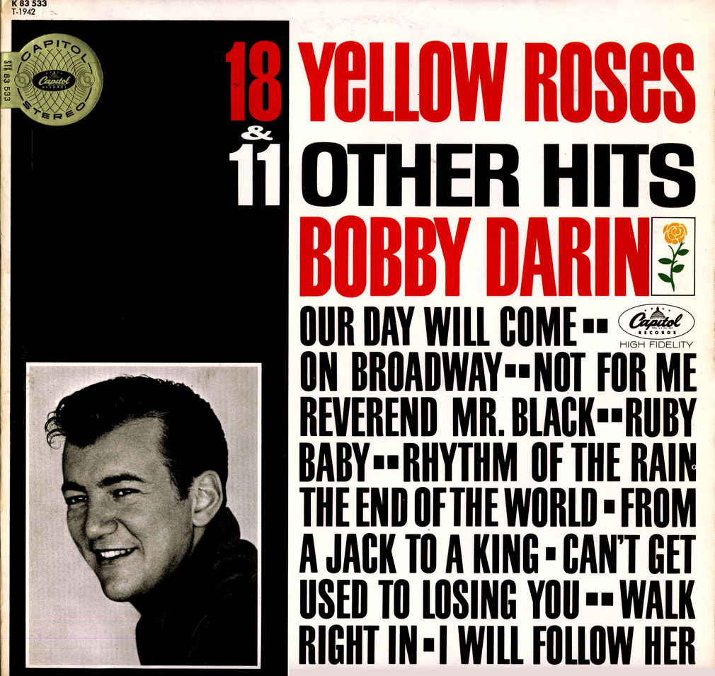 Swiss Gothic (with Biform alternates) and Fiedler Gothic in early use for 18 Yellow Roses. The album by Bobby Darin (1936–1973) “debuted on the Cashbox albums chart in the issue dated July 20, 1963, remaining on that chart for a total of seven weeks and hitting a peak position of number 69.”