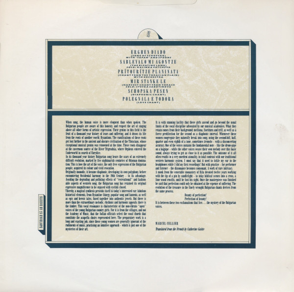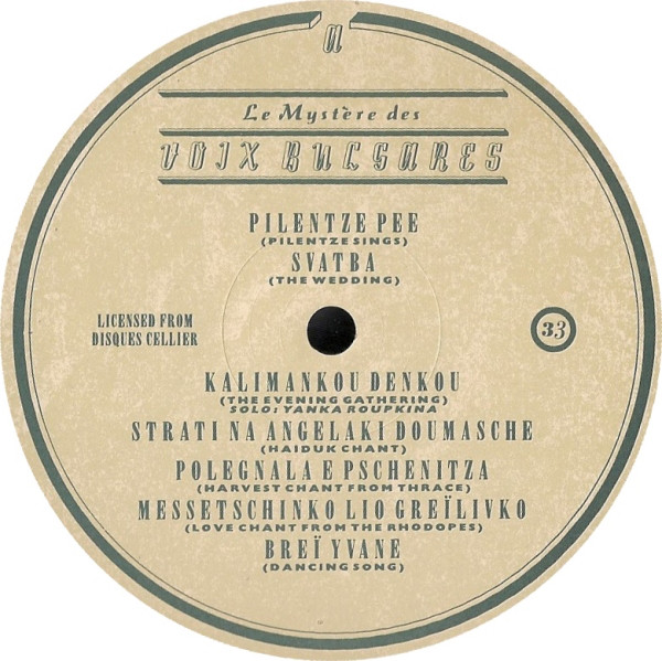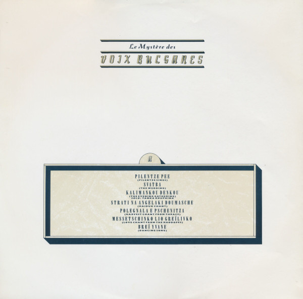 The artwork is just as enigmatic and difficult to place in time as the music. Performed by the Bulgarian State Television Female Vocal Choir and recorded by the Swiss ethnomusicologist Marcel Cellier in the mid 20th century, it was later referenced in the score of Xena: Warrior Princess, set in a fantasy version of ancient Greece.