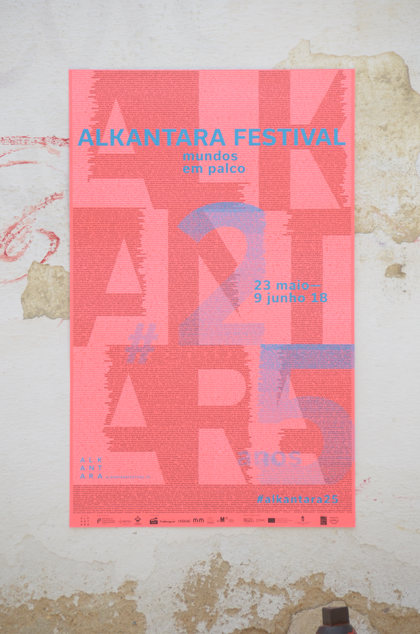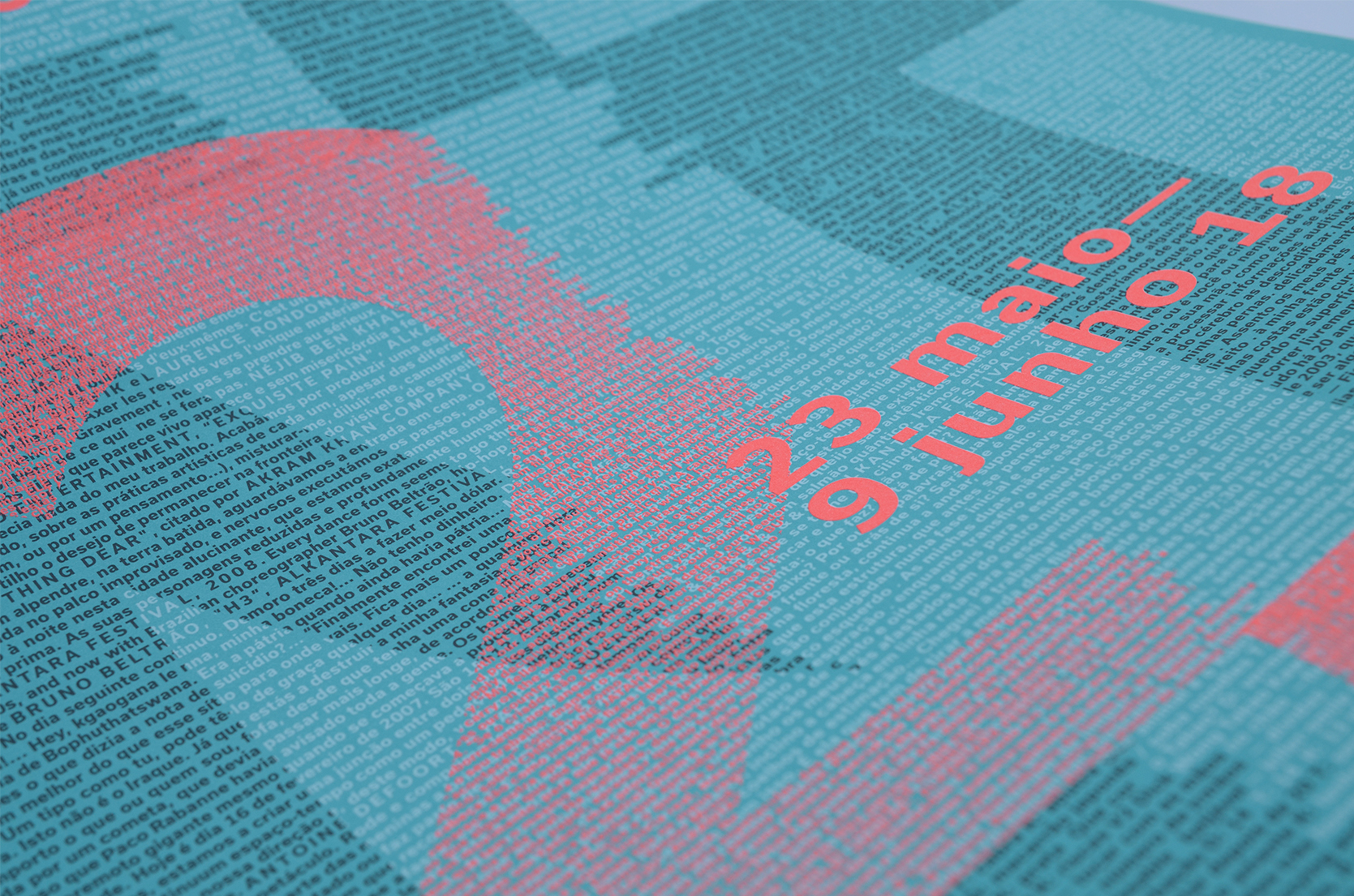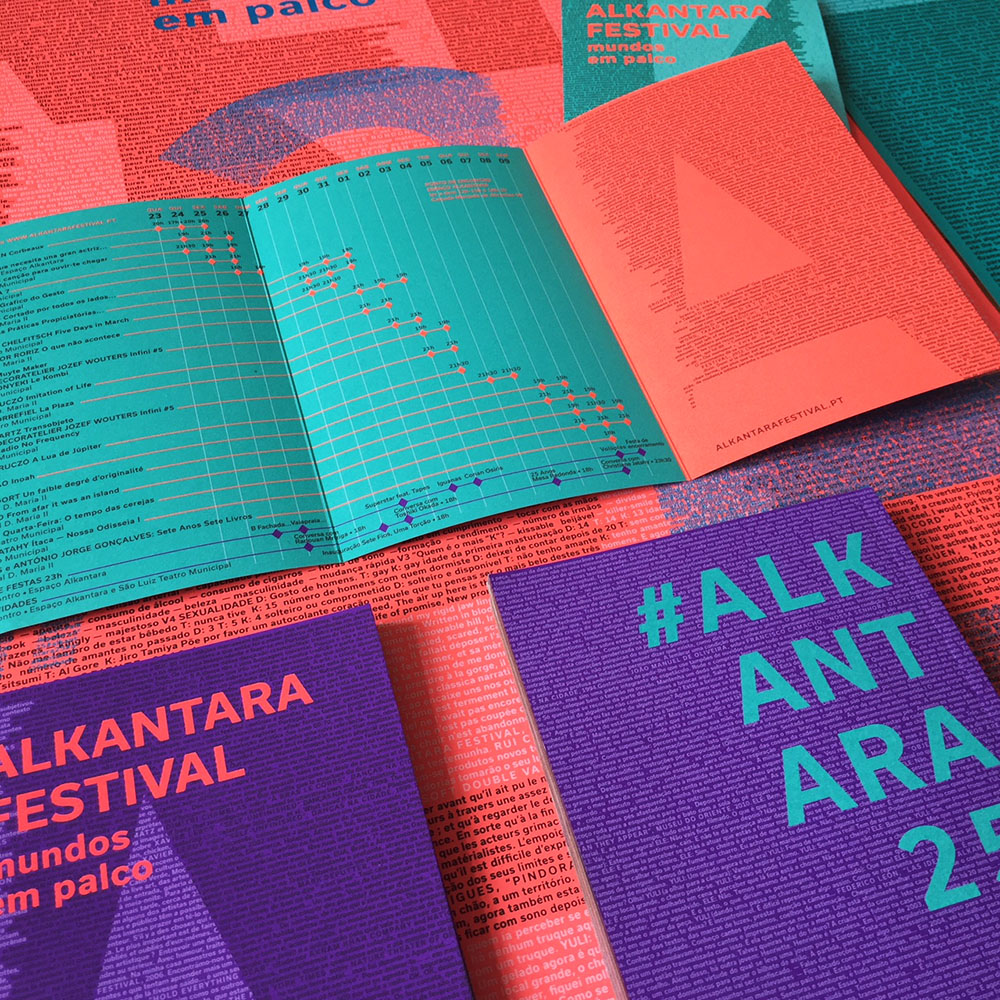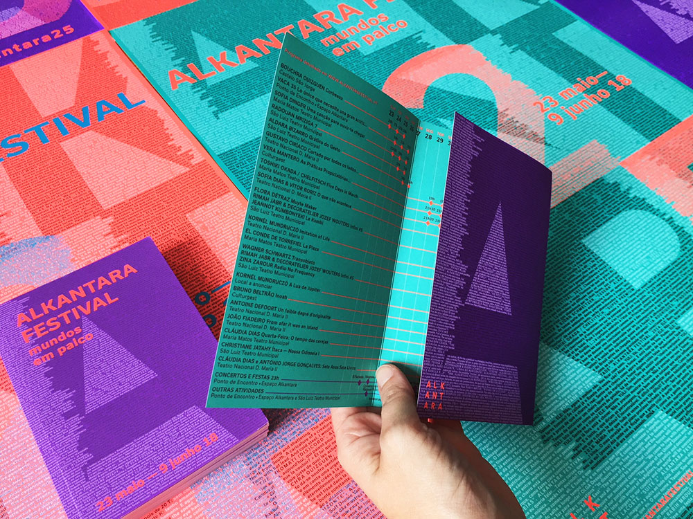 The visual identity of the 2018 Alkantara Festival, designed by Ana Teresa Ascensão, using the typeface Usual, is based on a 8,000-word collection of texts from the Alkantara archives. Excerpts from performances and catalogues, written by artists, artistic directors, journalists, and others, underlay this year’s commemorative program and provide possible readings of the 25-year history of Alkantara/Danças na Cidade.