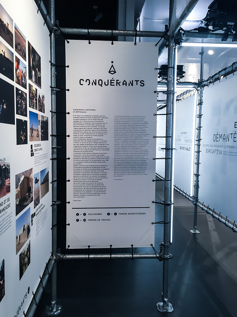 The panorama is exposed on scaffolding, obvious symbols of temporary constructions. The structure, conceived by 1024 architecture, proposes a linear path made of words, quotations and questions, from which are extracted paths to other worlds, rich in photos – those of the camps.