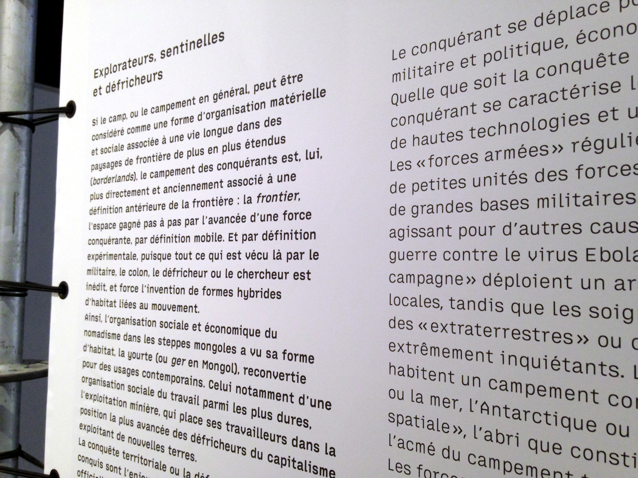 David Benmussa set the graphics and signage for the exhibition with several weights of Tuner, possibly because the uppercase A looks like a house or a tent, dwellings depicted in the exhibition. Titles are set in full caps, with each letter missing a part, like a building being erected or deconstructed. They are paired with abstract pictographic glyphs probably mimicking the “hobo signs”.