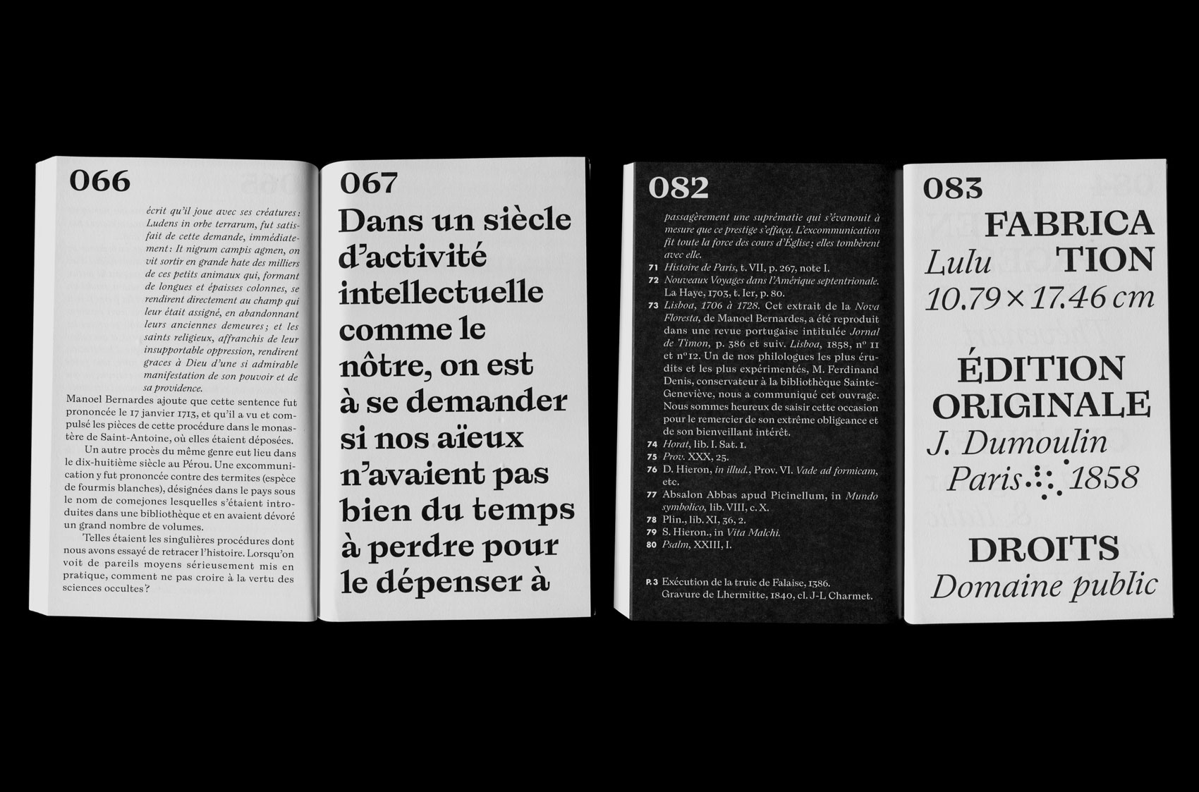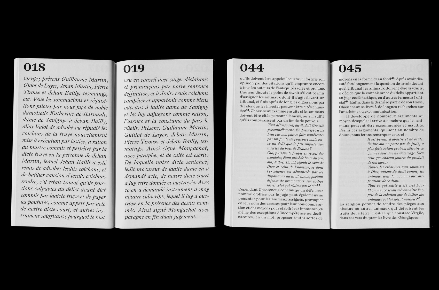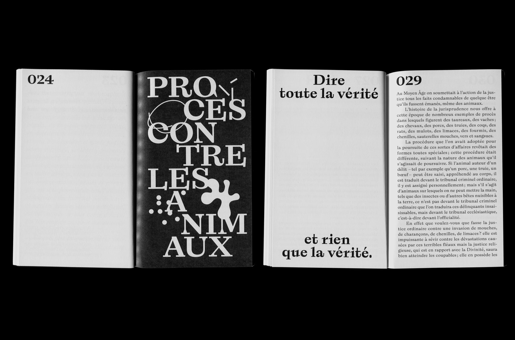 Curiosités judiciaires et historiques du Moyen Âge. Procès contre les animaux (“Judicial and historical curiosities of the Middle Ages. Trial against animals”) was written by Émile Agnel (1810–1882) and originally published in 1858. Axel Pelletanche Thévenart’s interpretation of the text is set in Laica. The digitally printed book has 84 pages and measures 108×175 mm. Learn more about the history of animal trials on Sarah Lippincott’s website.