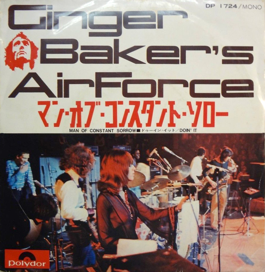 The Japanese version of Ginger Baker’s Air Force’s cover of “Man Of Constant Sorrow” was manufactured by Nippon Grammophon Co., Ltd. The ultrawide technoid letterforms are from a film typeface of unclear origin. It appeared as Astrid in a Lettergraphics catalog from 1968. Ten years later, Castcraft listed it as “Aggie (similar to Astrid Solid)”. This name is also the one used for the digitally available versions, OPTI Aggie Solid and URW Aggie.