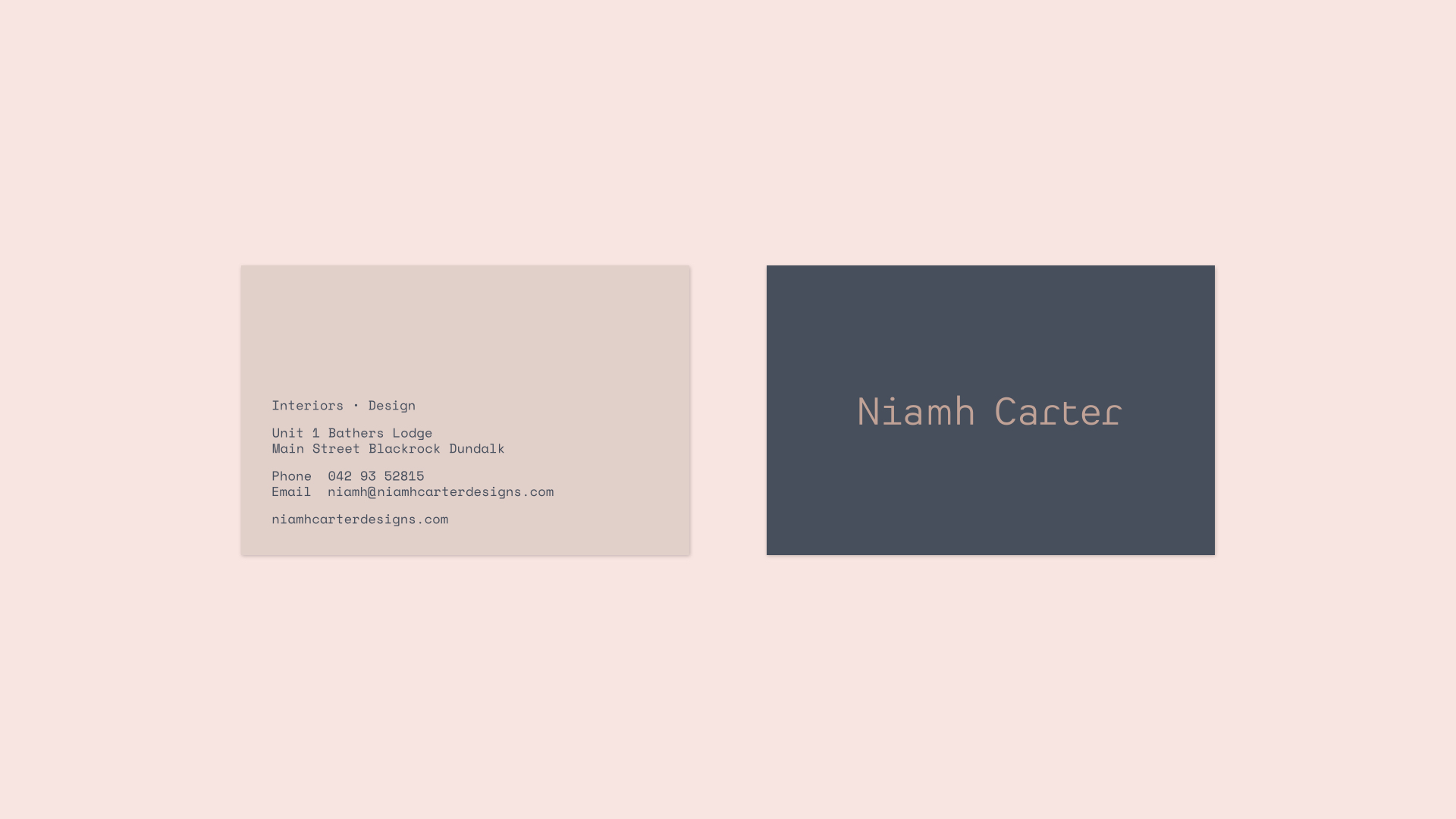 Niamh Carter is a designer who works within the areas of commercial and residential interiors. After 15 years in business, with expansion and relocation to a larger premises, there was a need for a fresh and contemporary brand identity for the company. Using a muted colour palette, the new logotype has a humanist, idiosyncratic personality to reflect the diverse and tactile nature of the field they work in. The sign on the façade was executed expertly by Wonders & Signs.