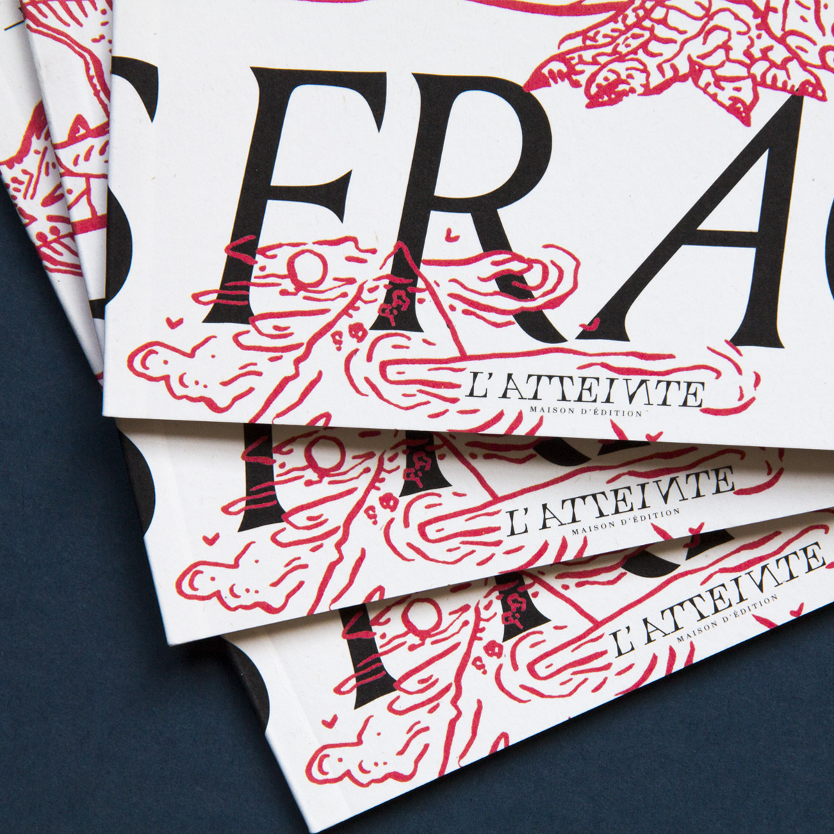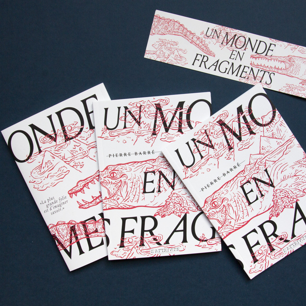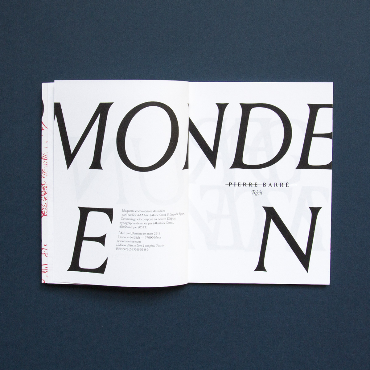 With Louize Display (designed by Matthieu Cortat) Atelier AAAAA designed the layout and illustrated the cover of the poem “Un monde en fragments” by Pierre Barré, the first publication of the young publisher L’Atteinte in Metz. The publisher’s logo uses Totentanz by Yoann Minet.