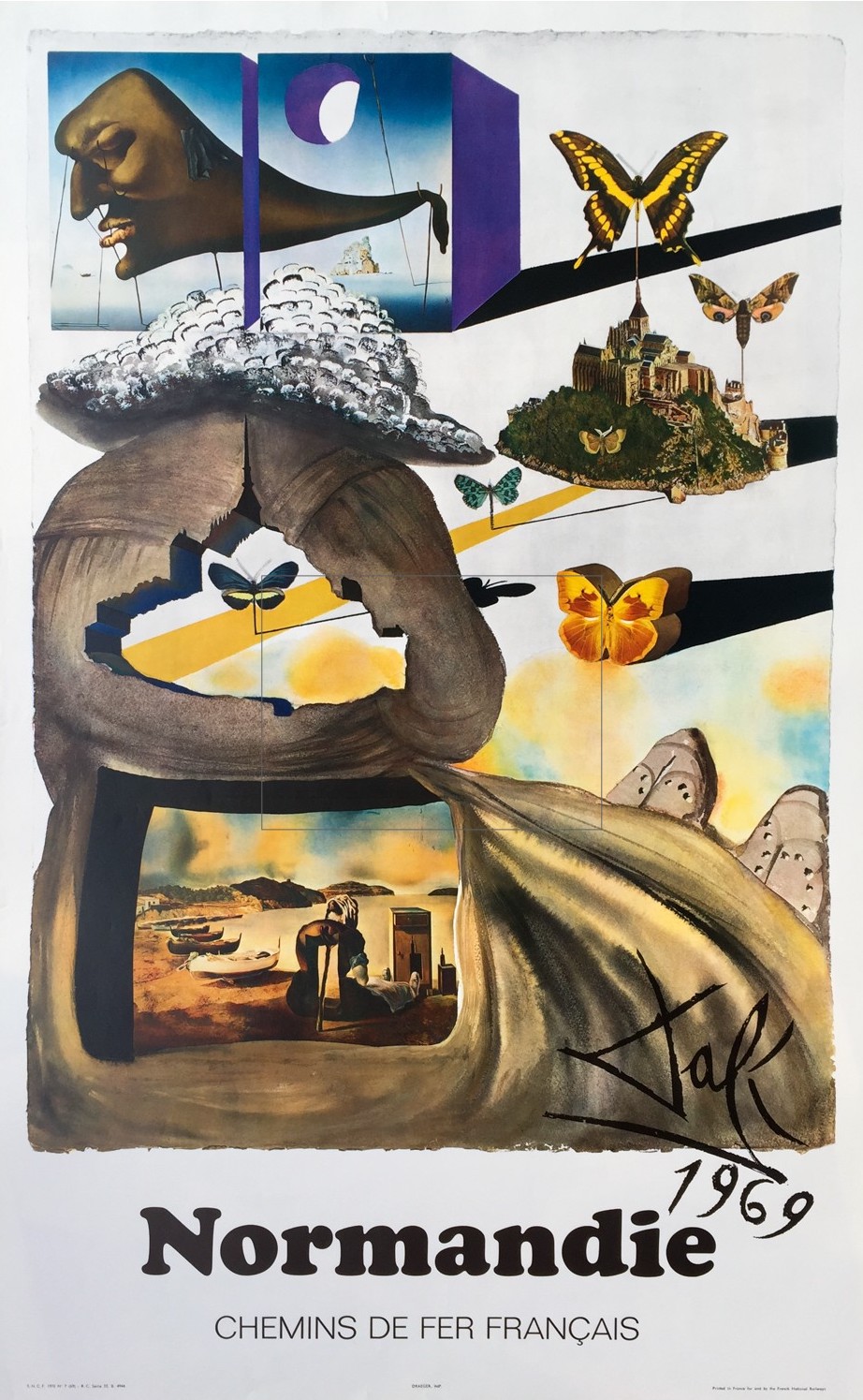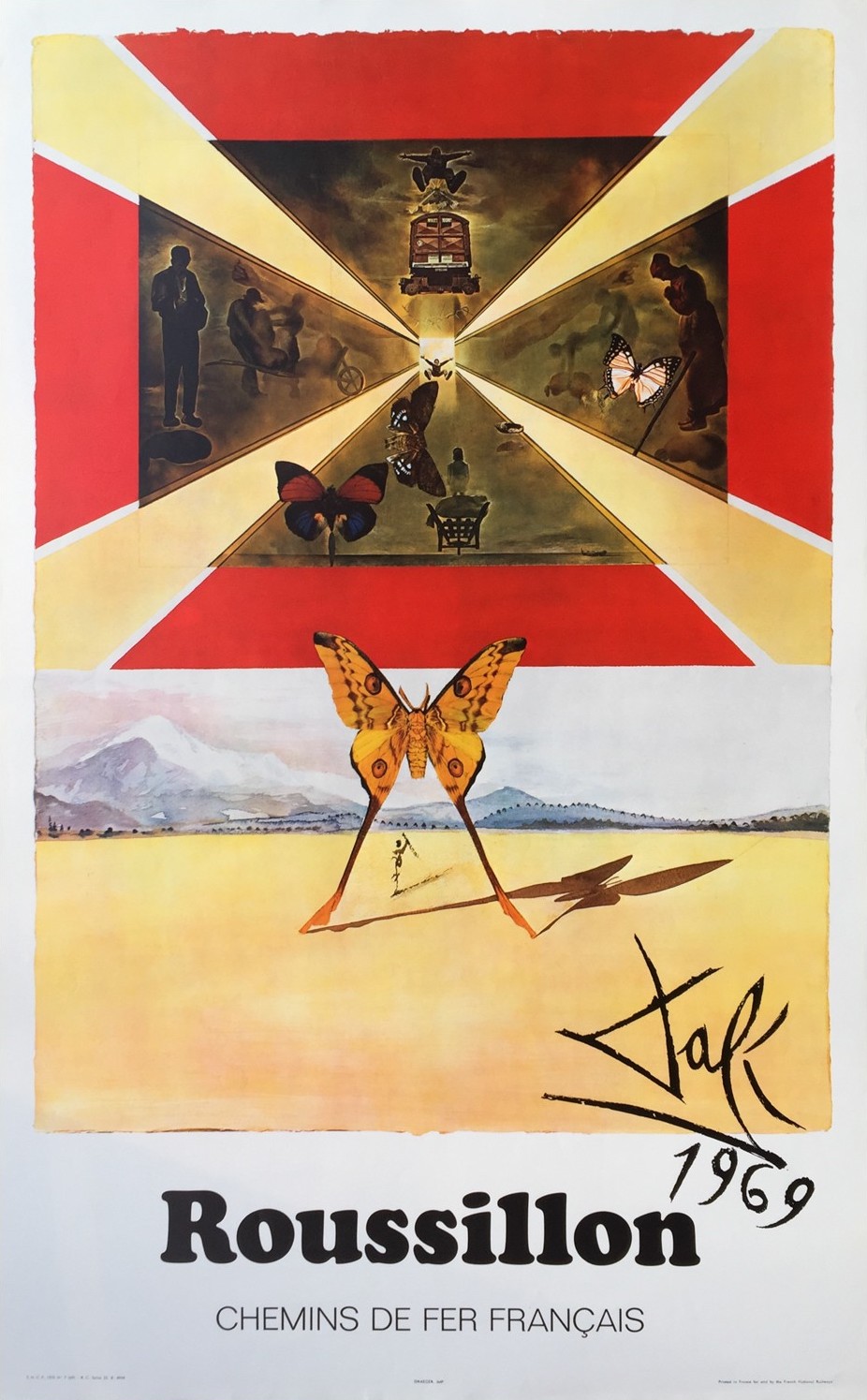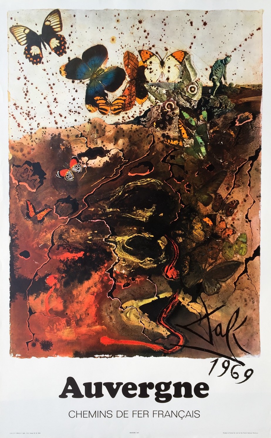 Promotional posters for the SNCF (Société nationale des chemins de fer français / French National Railway Company) made by Salvador Dalí in 1970. On each poster, a region of France is depicted(?) in an image with butterflies – that’s why this poster series is also known as “the Butterfly Suite”.