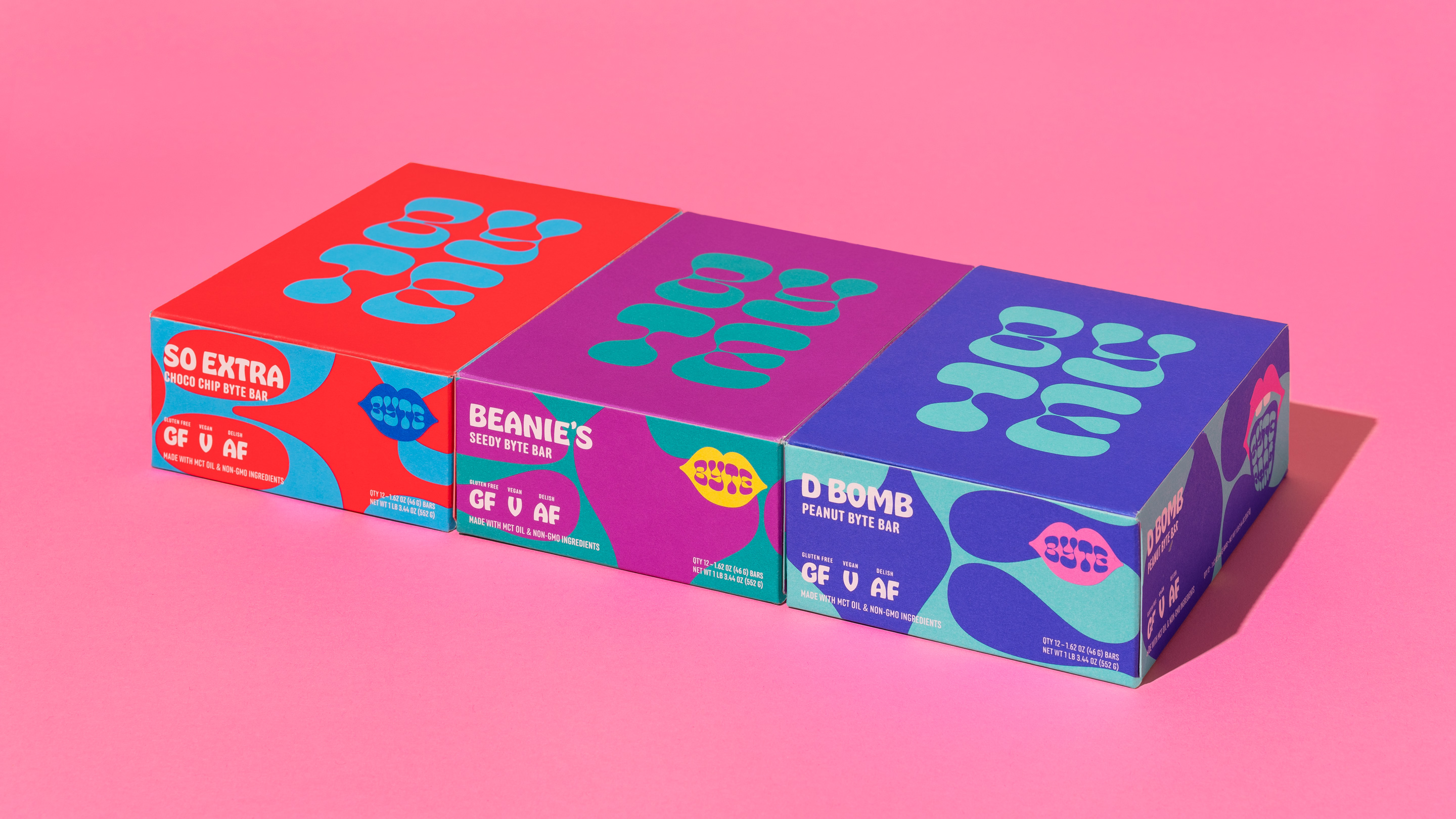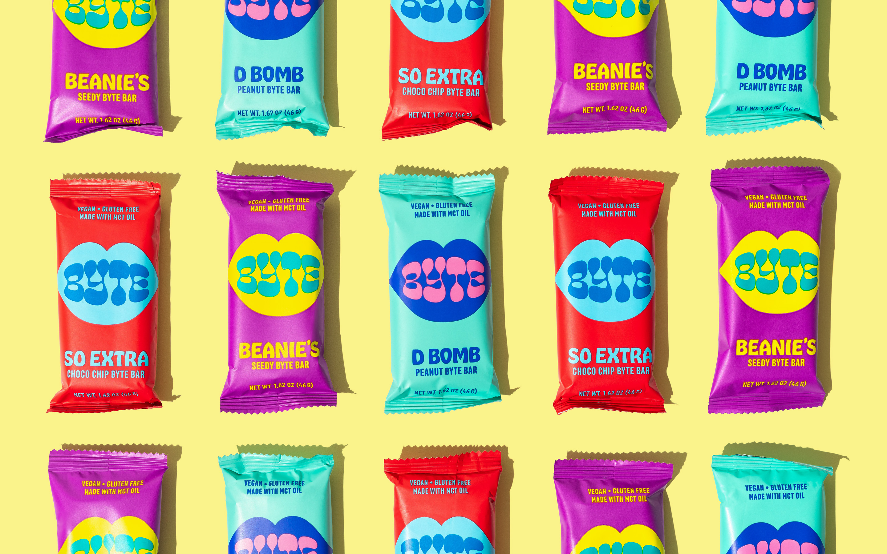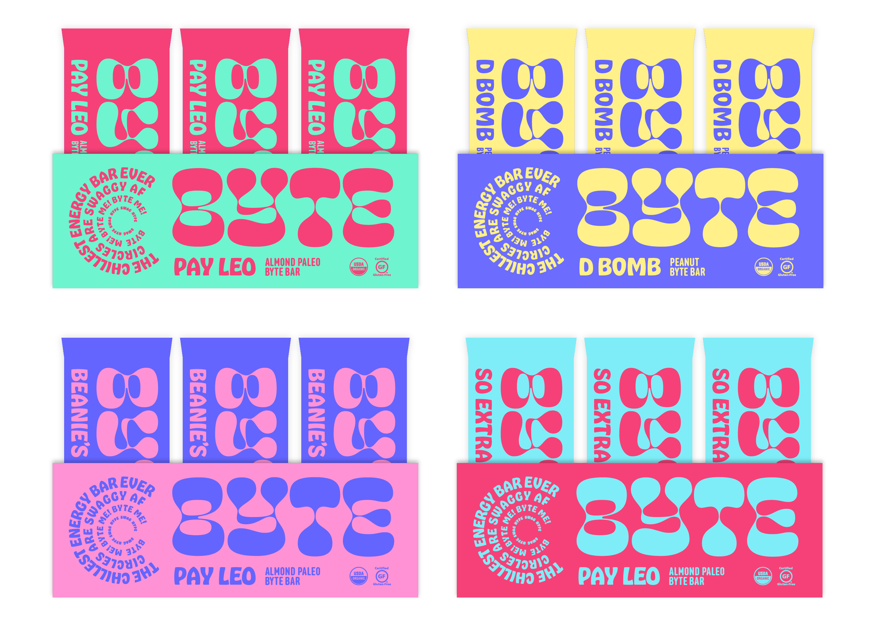 Competing in a saturated snack bar market, we developed a strategy for Byte Bars that subverts stereotypical “crunchy granola” aesthetics. Cheee by Oh no Type Co. was used for all of the brand’s wordmarks and featured prominently on the packaging—lending the brand a youthful irreverence. Hobeaux—also created by James T. Edmondson—was used as a display face to support the brands’ illustrative logos. Anchor by Process Type fits right in with its round letterforms. The condensed nature of Anchor also helped with the challenges of designing a small package.