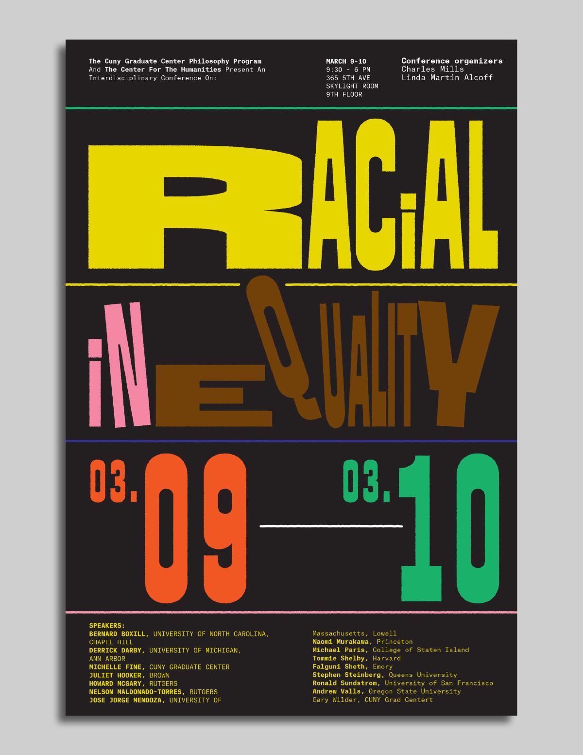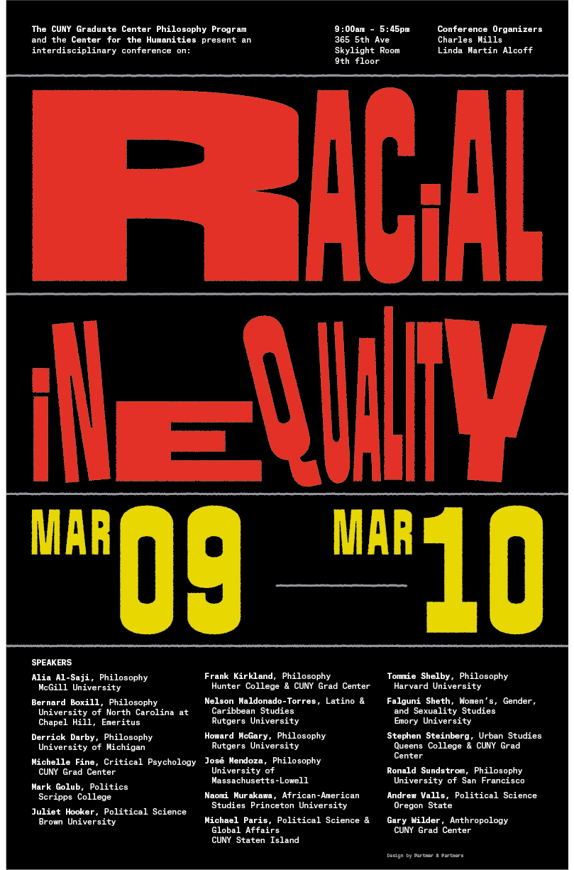 Posters for the Racial Inequality Conference. This 2-day interdisciplinary conference at CUNY’s Center for the Humanities recognizes the urgent need to look at the enduring problem of racial inequality from distinctive perspectives: philosophy, political theory, ethnic studies, critical psychology, urban studies, gender theory, and anthropology.
