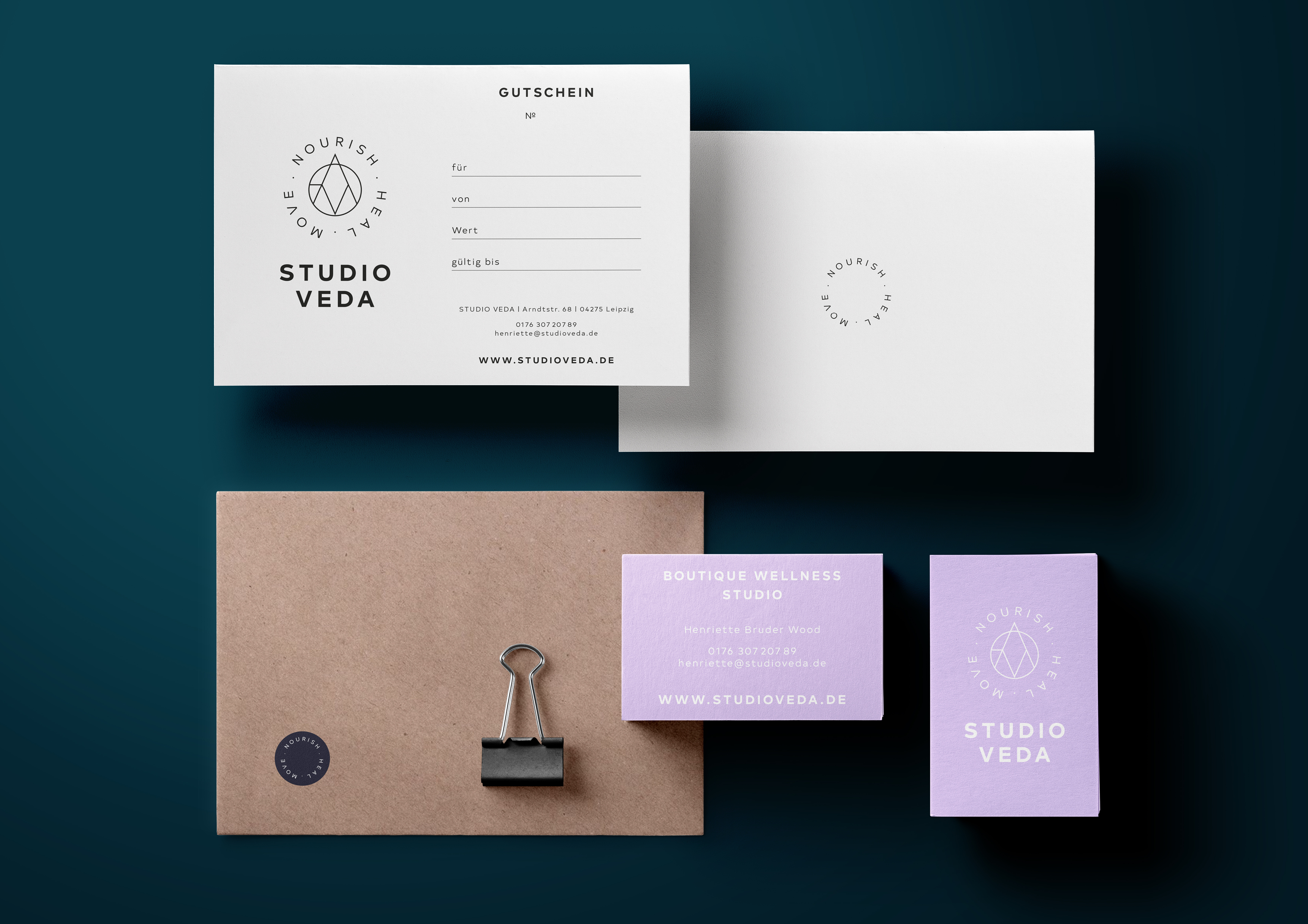 Studio Veda is a boutique barre & lifestyle studio in Leipzig, Germany, with a holistic training approach. Mindt realized the redesign of the studio identity. All branding elements can be combined in multiple ways for various uses. The signet symbolizes and forms the word VEDA (Sanskrit for traditional descended knowledge) in a timeless and modern way. All typography is typeset in Typold.
