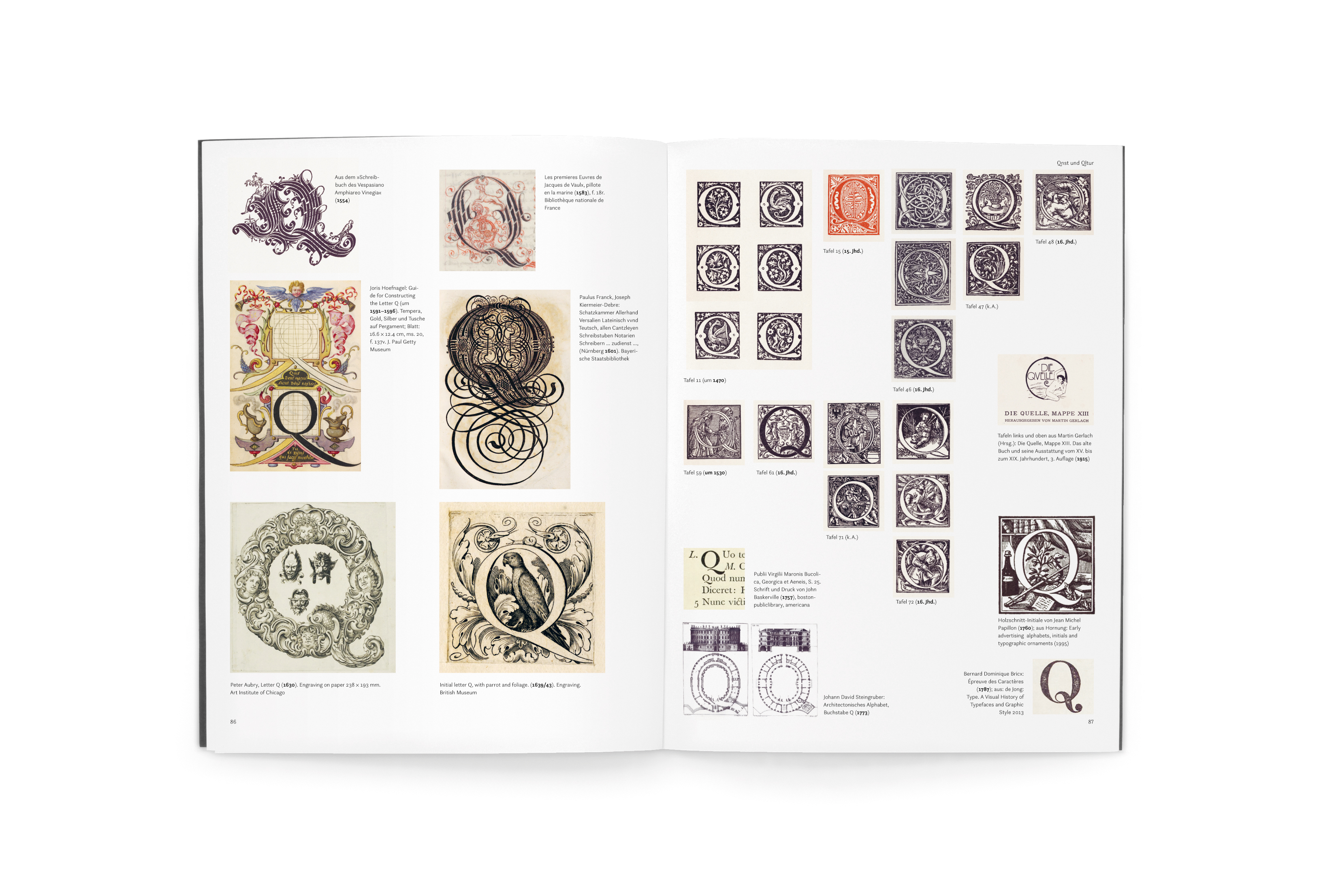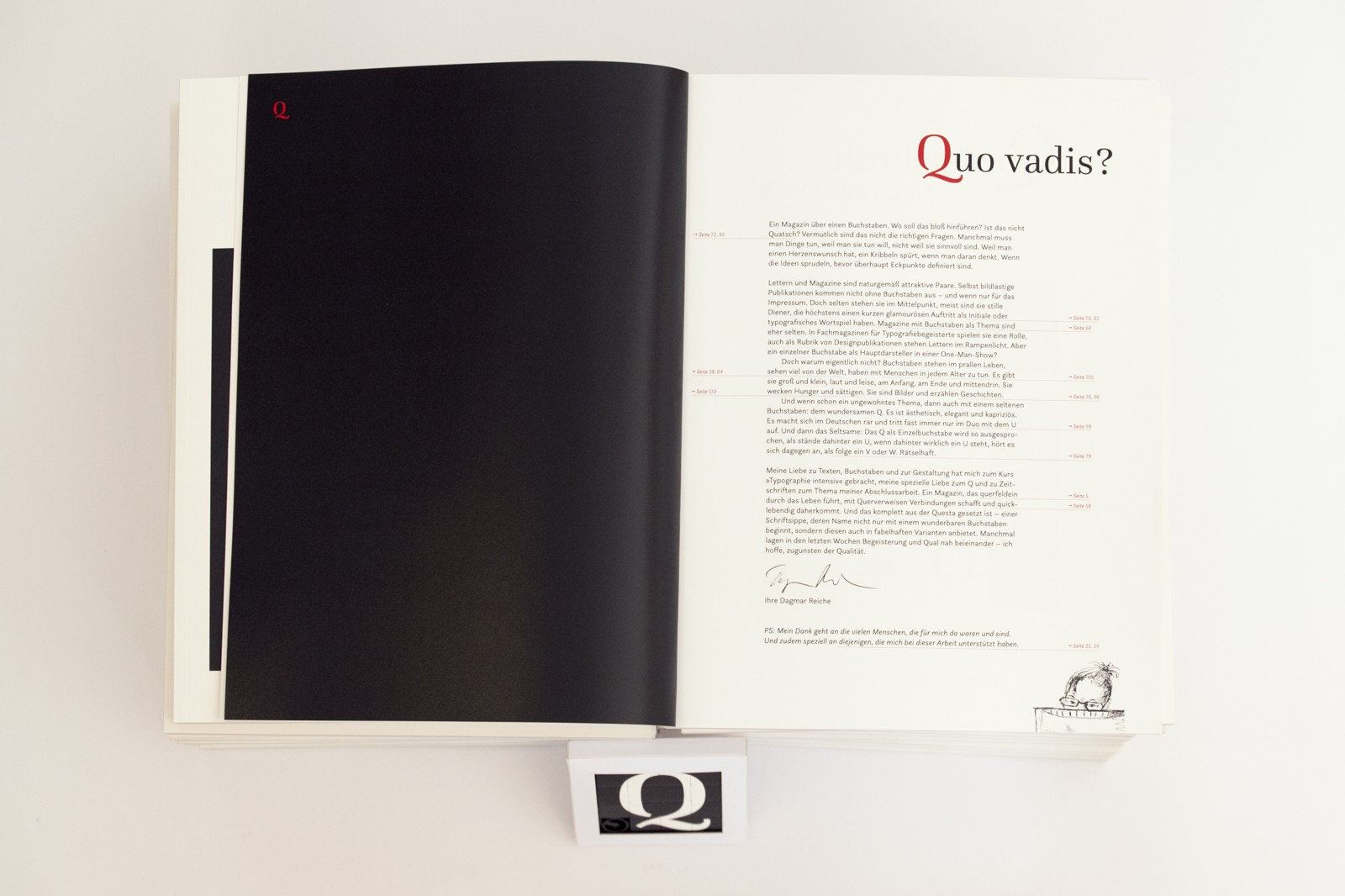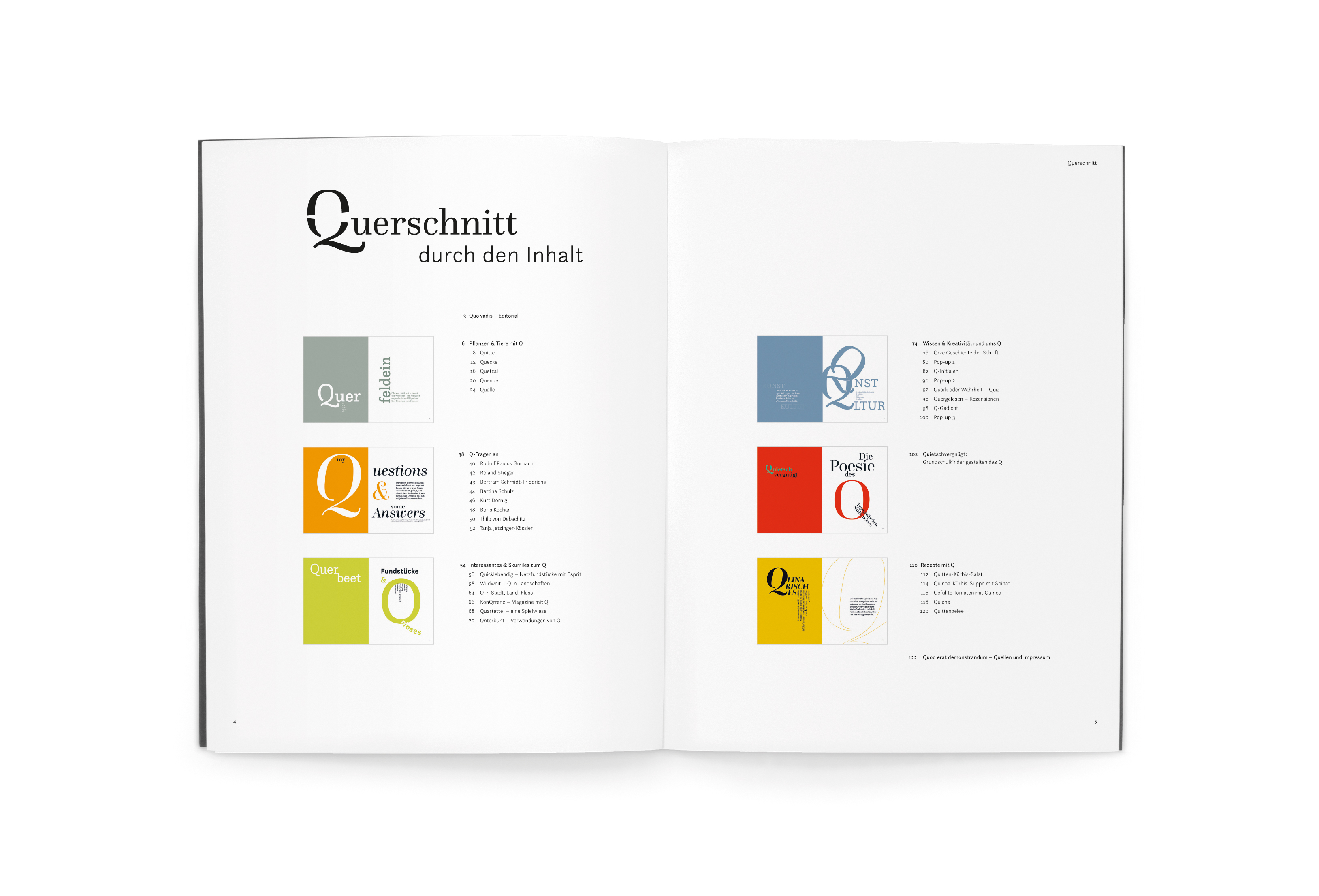 The exploration of the topic – the letter Q – from different angles is reflected by categories. In the chapter opening, the topic is briefly explained and translated typographically. Illustrations, photos and pop-ups create a visual bridge to topics and texts.