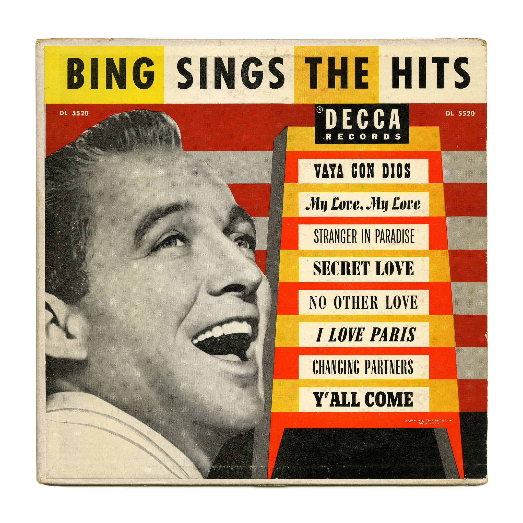 Bing Sings the Hits is a compilation of hit songs by Bing Crosby from the early 1950s. It was issued as a 10″ LP by Decca Records in 1954. Each of the eight titles is shown on a separate card—jukebox style—and is set in a different typeface. The selection provides a good sample of what was popular in the US in the 1950s, and also includes the less commonly seen Contact Italic (for “I Love Paris”). The titles are all presented in capitals, with the exception of “My Love, My Love”: Allegro with its cursive forms doesn’t lend itself to being used in all caps. (Barbara deWilde disagrees.)
