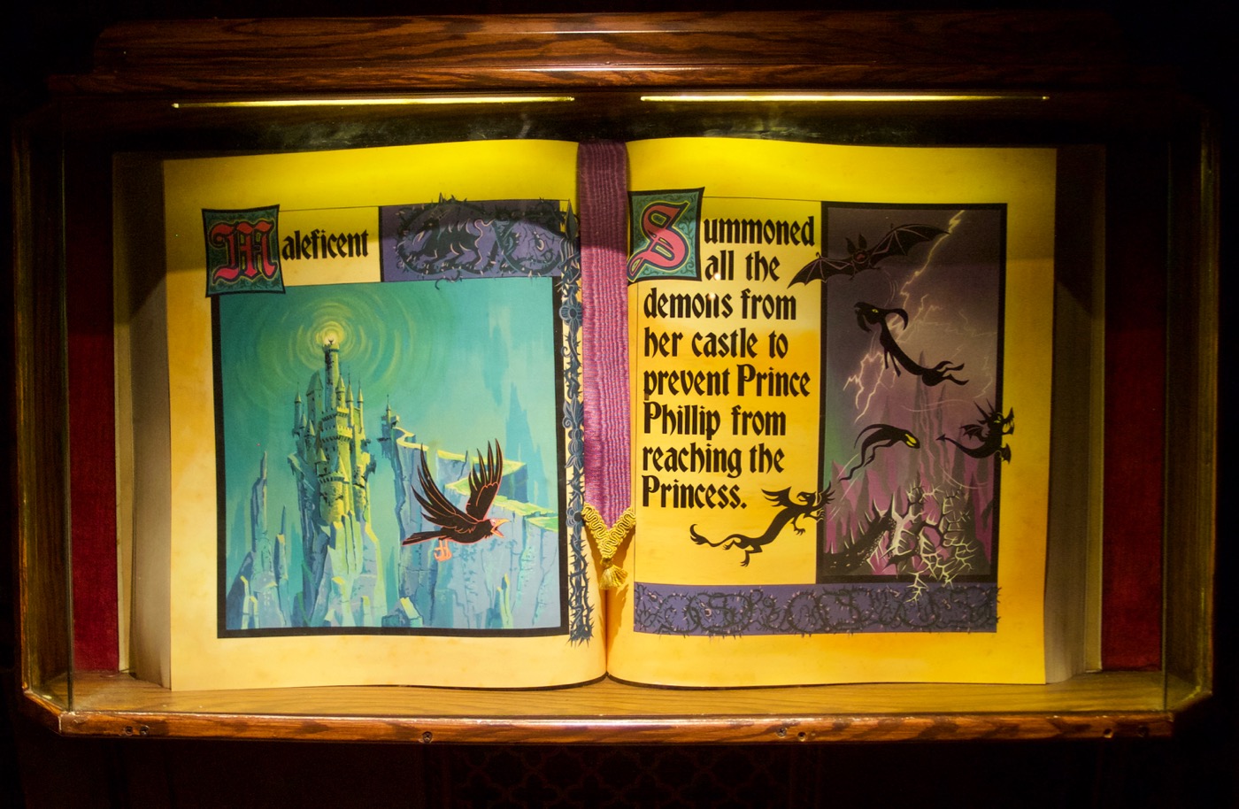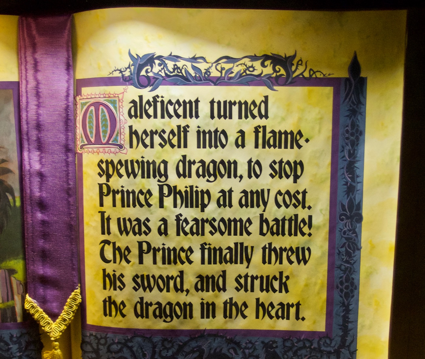 From its logo to park signage and decoration, Disneyland is strongly associated with various styles of fraktur, particularly simplified and romanized versions of the style that are more palatable to those unfamiliar with traditional blackletter. Bradley is one of the typefaces used frequently throughout the park, especially in Fantasyland. It plays a starring role in Disneyland’s castle centerpiece, wherein the story of Sleeping Beauty is told through several dioramas, along with book displays. The walk-thru was originally designed in the style of Eyvind Earle, production designer for Disney’s 1959 film Sleeping Beauty, including books with hand calligraphy. After various changes to the castle interior over the years, Earle-style dioramas returned in 2008. I assume that’s when these new books appeared, typeset primarily in Bradley.