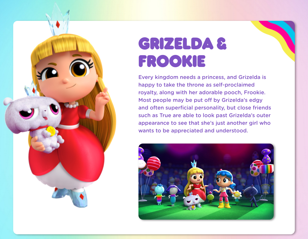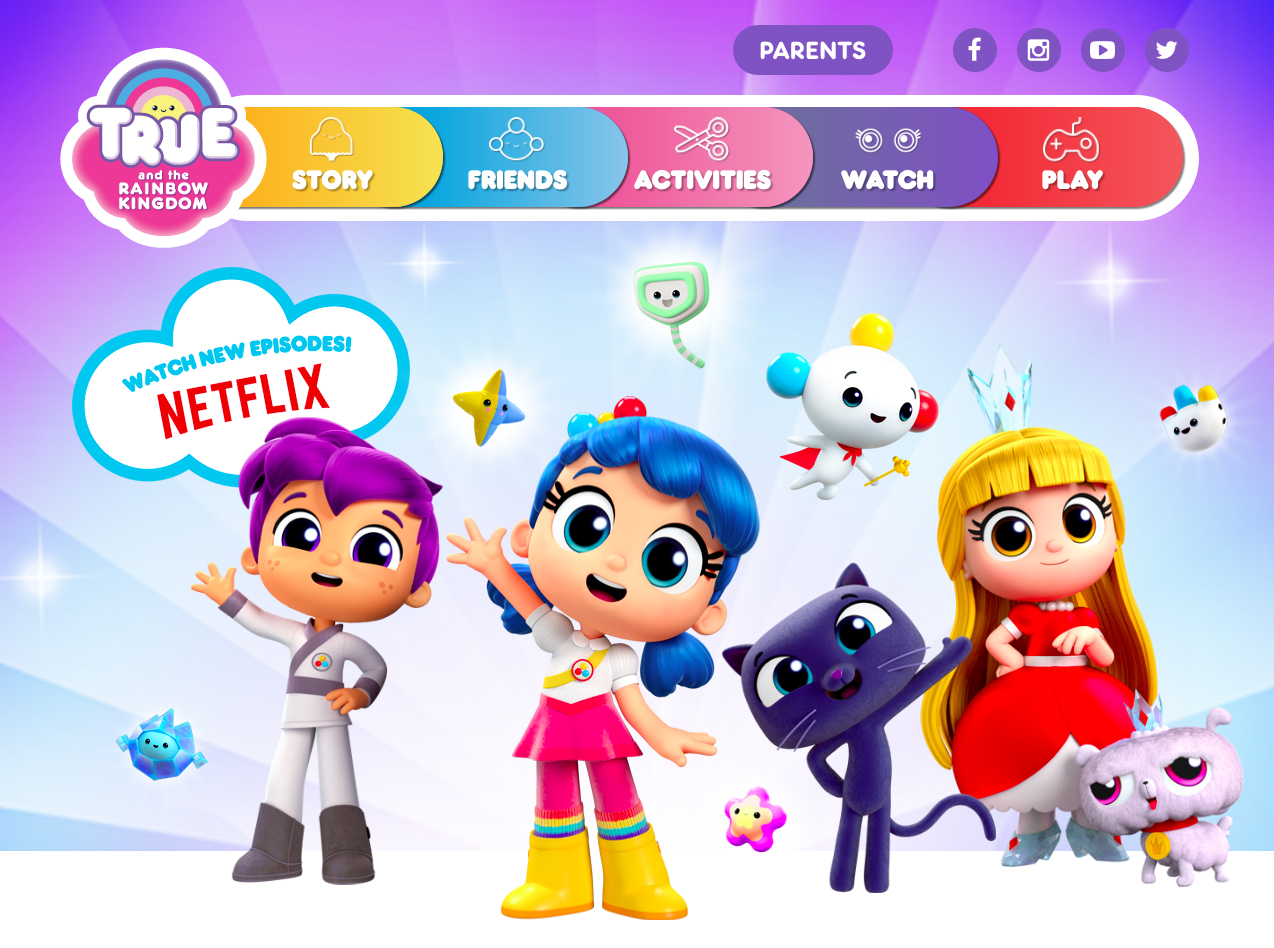 True and the Rainbow Kingdom is a Canadian animated web series targeting children, produced for Netflix by Guru Studio, in collaboration with Home Plate Entertainment, American artist duo FriendsWithYou, and Pharrell Williams’ I Am Other. It is based on the artworks by FriendsWithYou. The series premiered on the subscription streaming platform on August 11, 2017. — Wikipedia