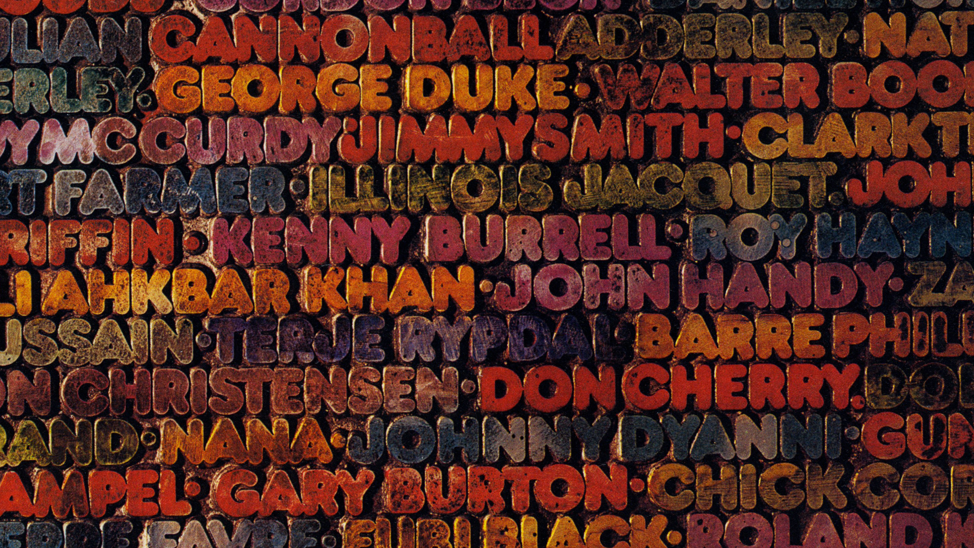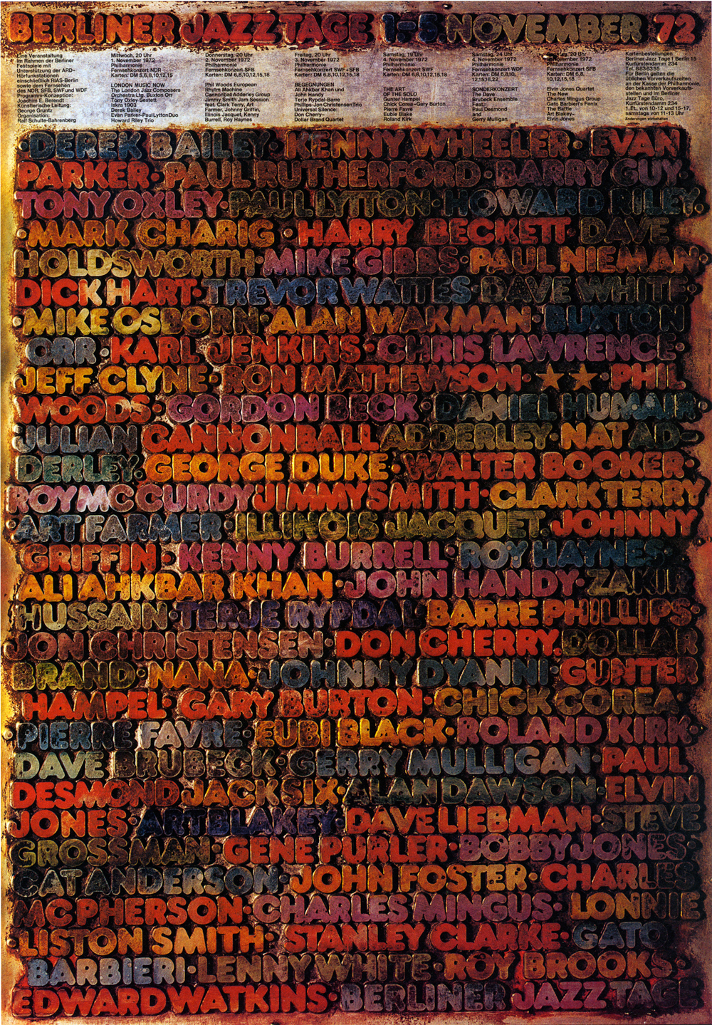 The font in use is Frankfurter which was released by Letraset two years earlier. The typography consists of a photography of a block of text, with artists names inked in different colours, ready to make print, or just after having made a print (which would show mirrored type). The space between the letters is dirty, as if this block has been used many times before — which of course is not the case.