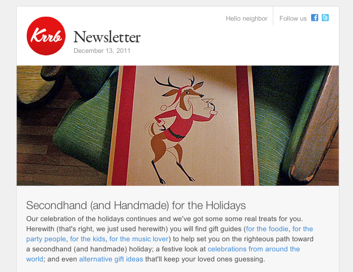 Krrb is a marketplace for selling used goods to local buyers. In short, a stylish alternative to craigslist. Despite the slightly clumsy, forced connection of the ‘Kr’, the logo grabs you. It immediately says that this is a fun and friendly way to buy and sell stuff. It’s effective throughout the branding – from the website to the newsletter to the iPhone app.