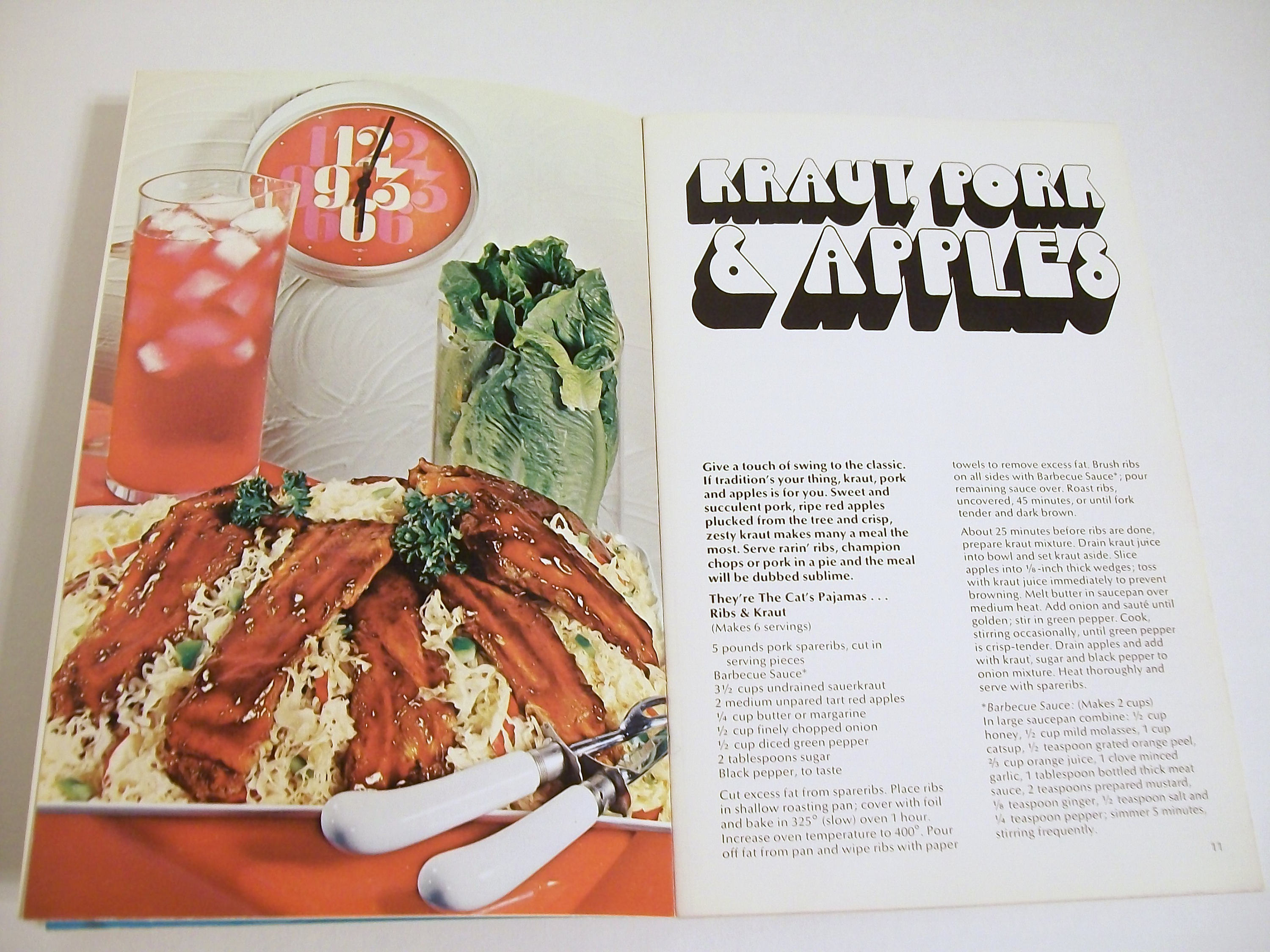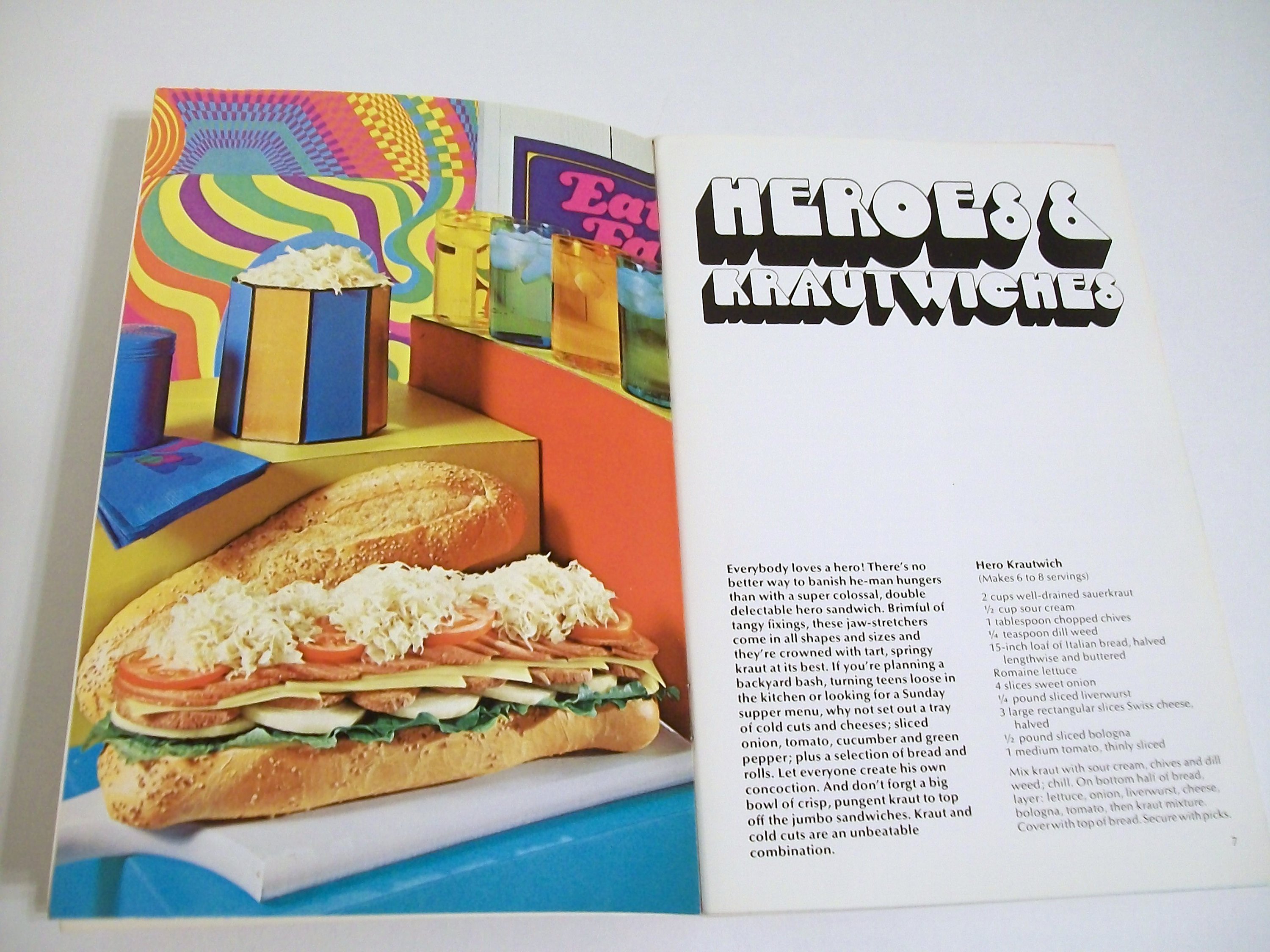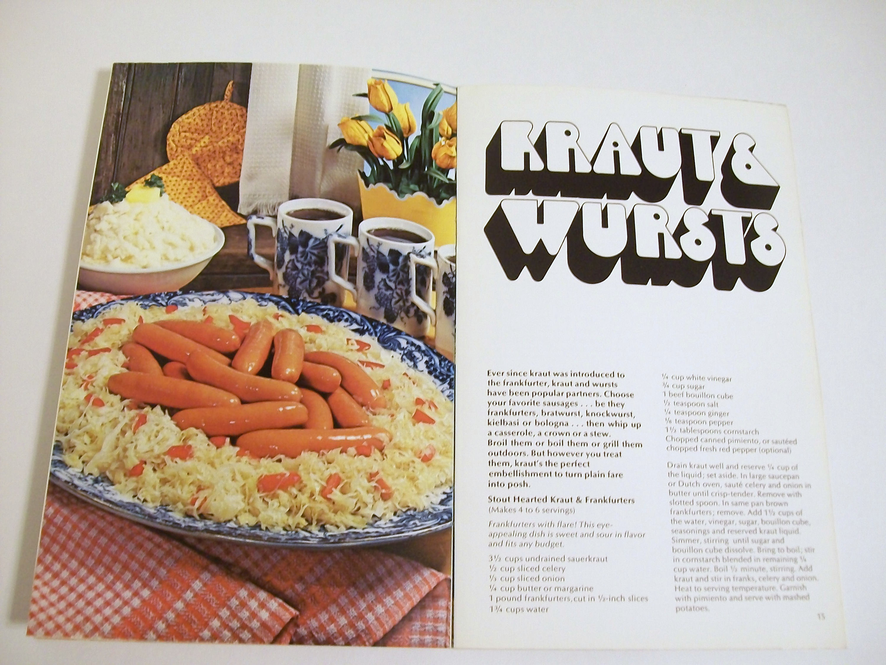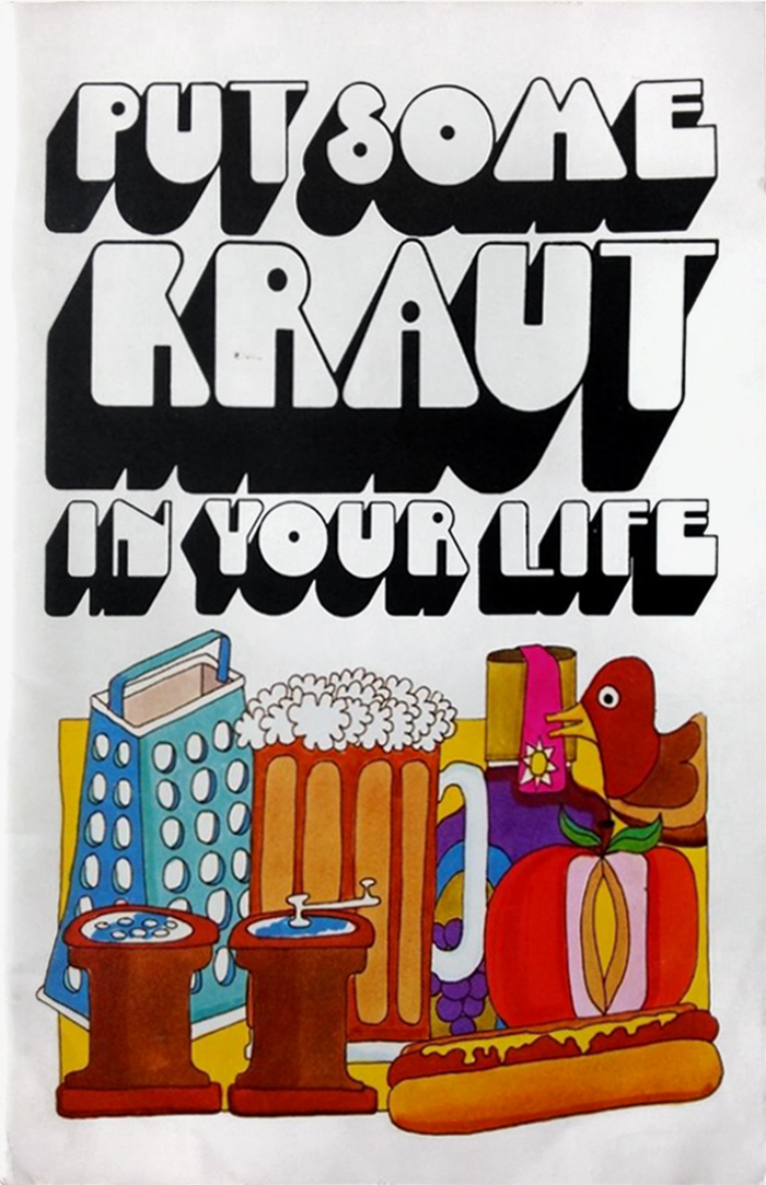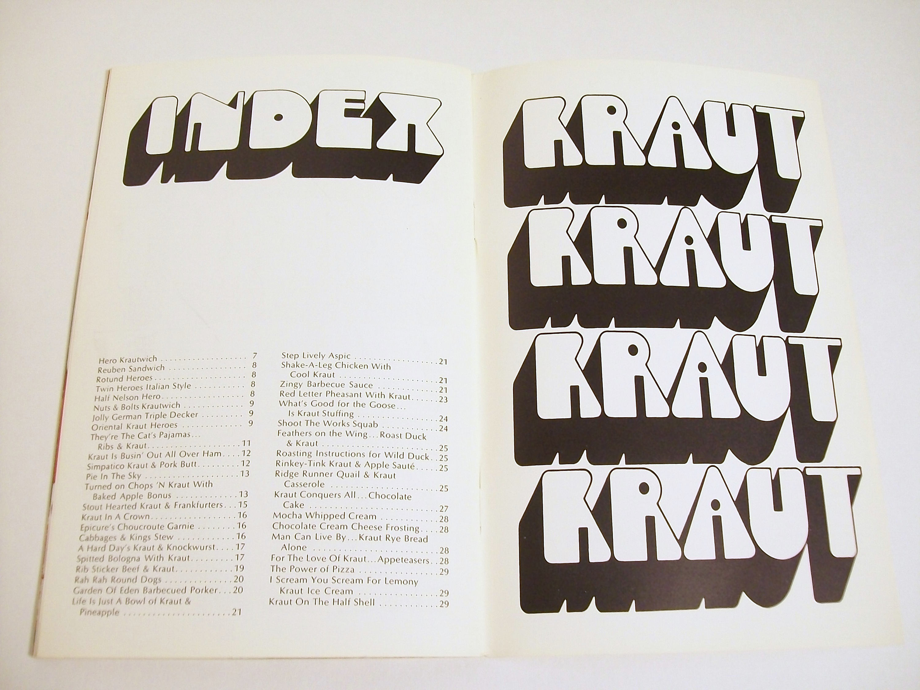 This 32-page full color recipe booklet was published by the National Kraut Packers Association of St. Charles, Illinois in ca. 1975. The typeface used for the cover and the headings is Mierop Ginger Snap C, designed by Craig Mierop for Photo-Lettering, Inc.