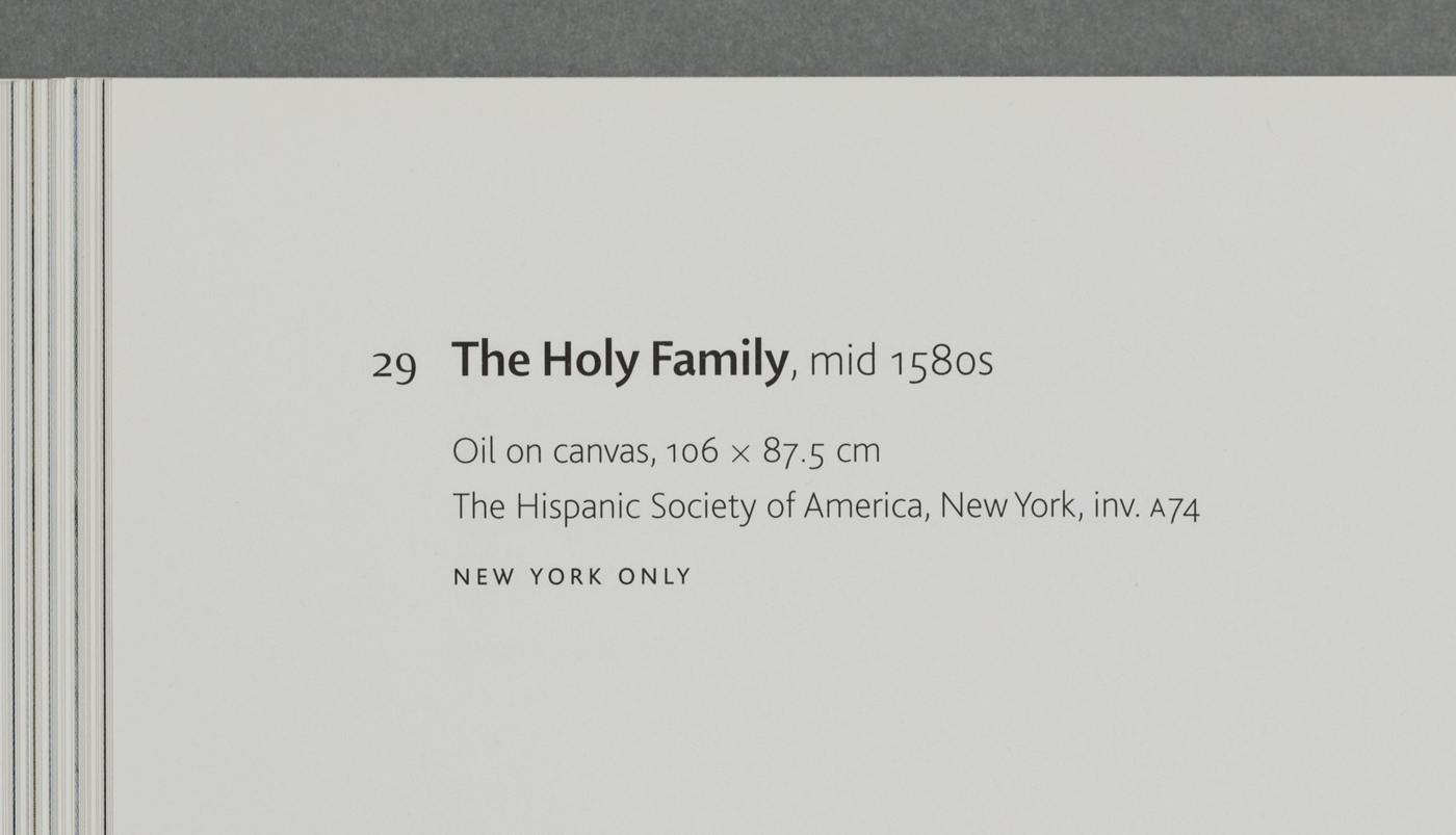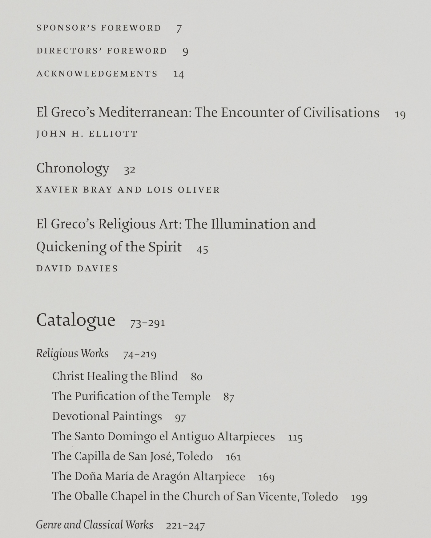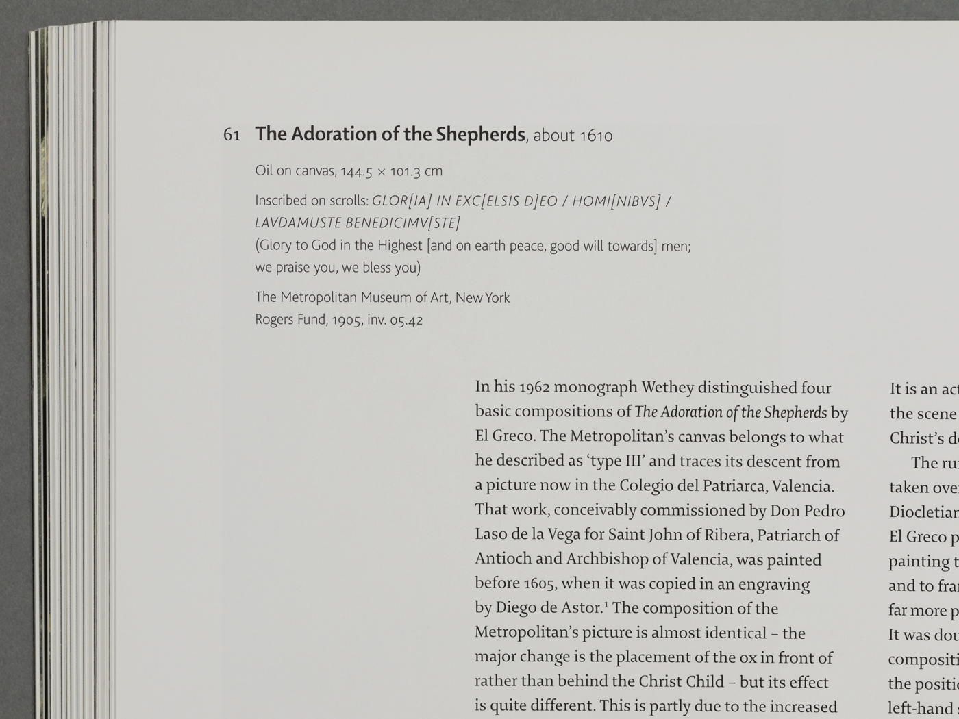 This book was published to accompany the exhibition El Greco at The Metropolitan Museum of Art, New York, (October 2003 to January 2004), and at The National Gallery, London (February to May 2004). Body text is set in Enigma with chapter head and artwork titles in Shaker. Bliss is used for artwork details and notes.