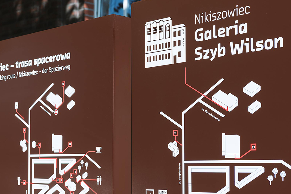 Each point on the walking route got a unique pictogram. They make the sights more recognizable and give a pleasant look to all information carriers. We also paid a lot of attention to the typeface choice – and decided on FF Chambers Sans by Verena Gerlach. In our opinion it looks great in large point sizes and has a unique look which emphasises the extraordinary character of the space.