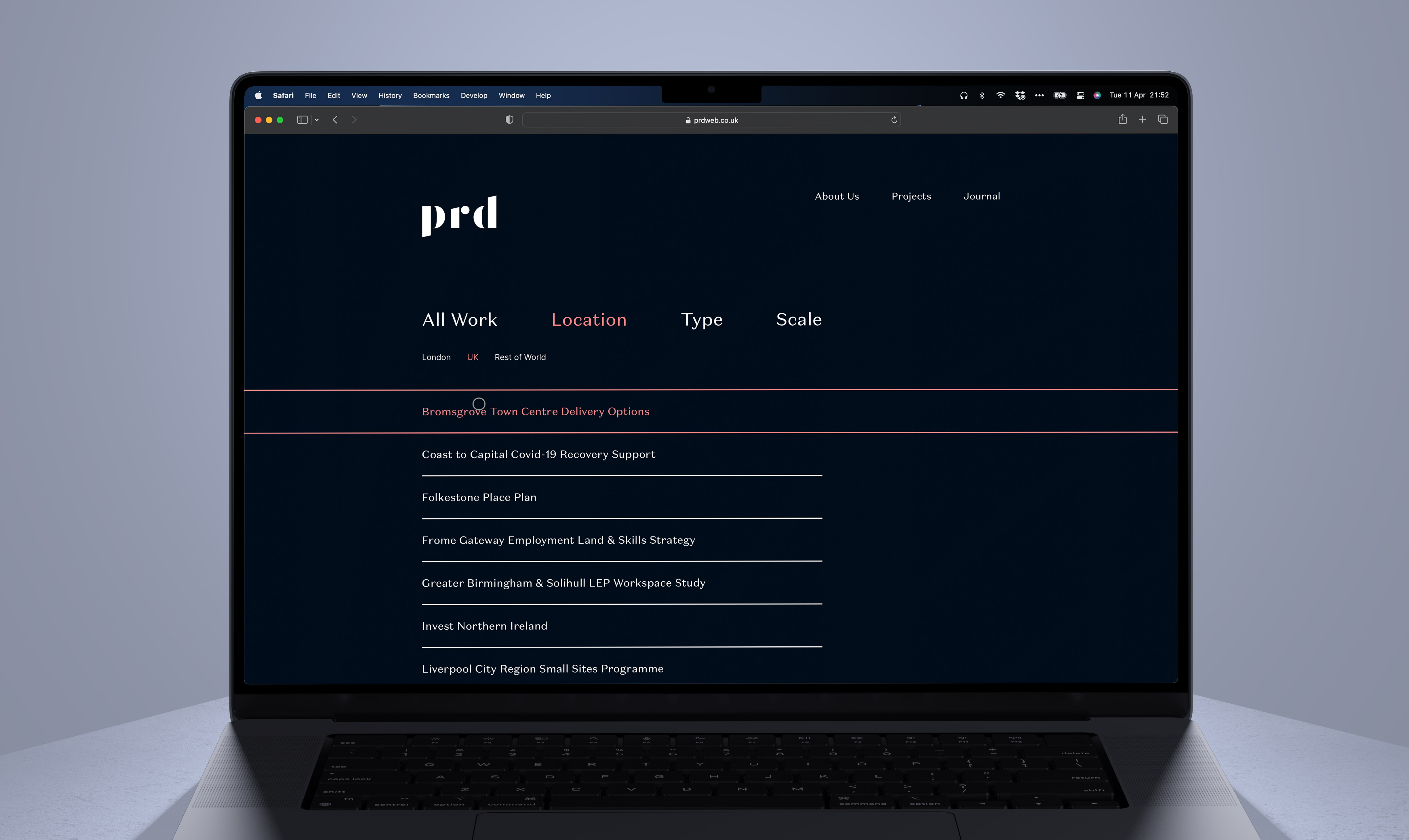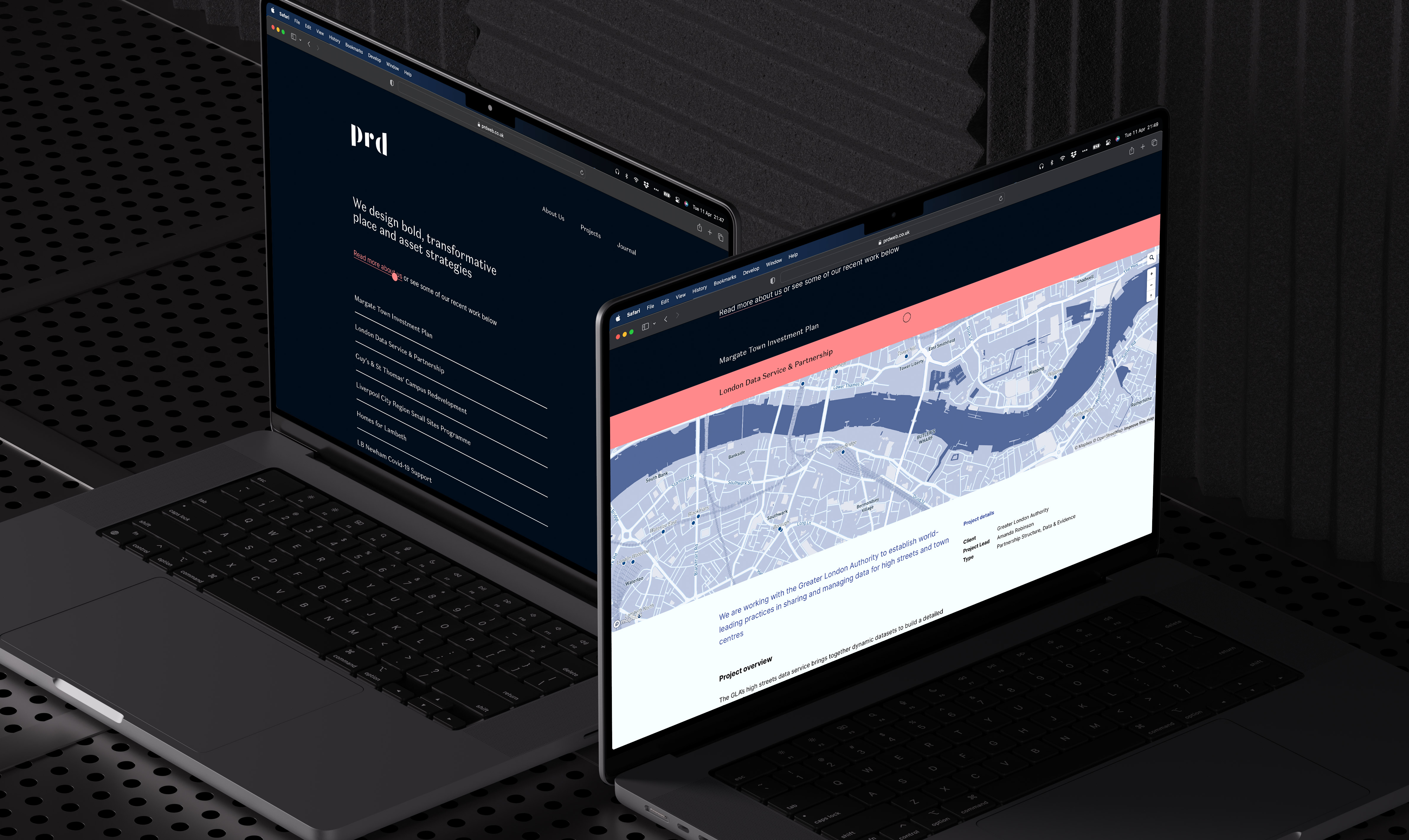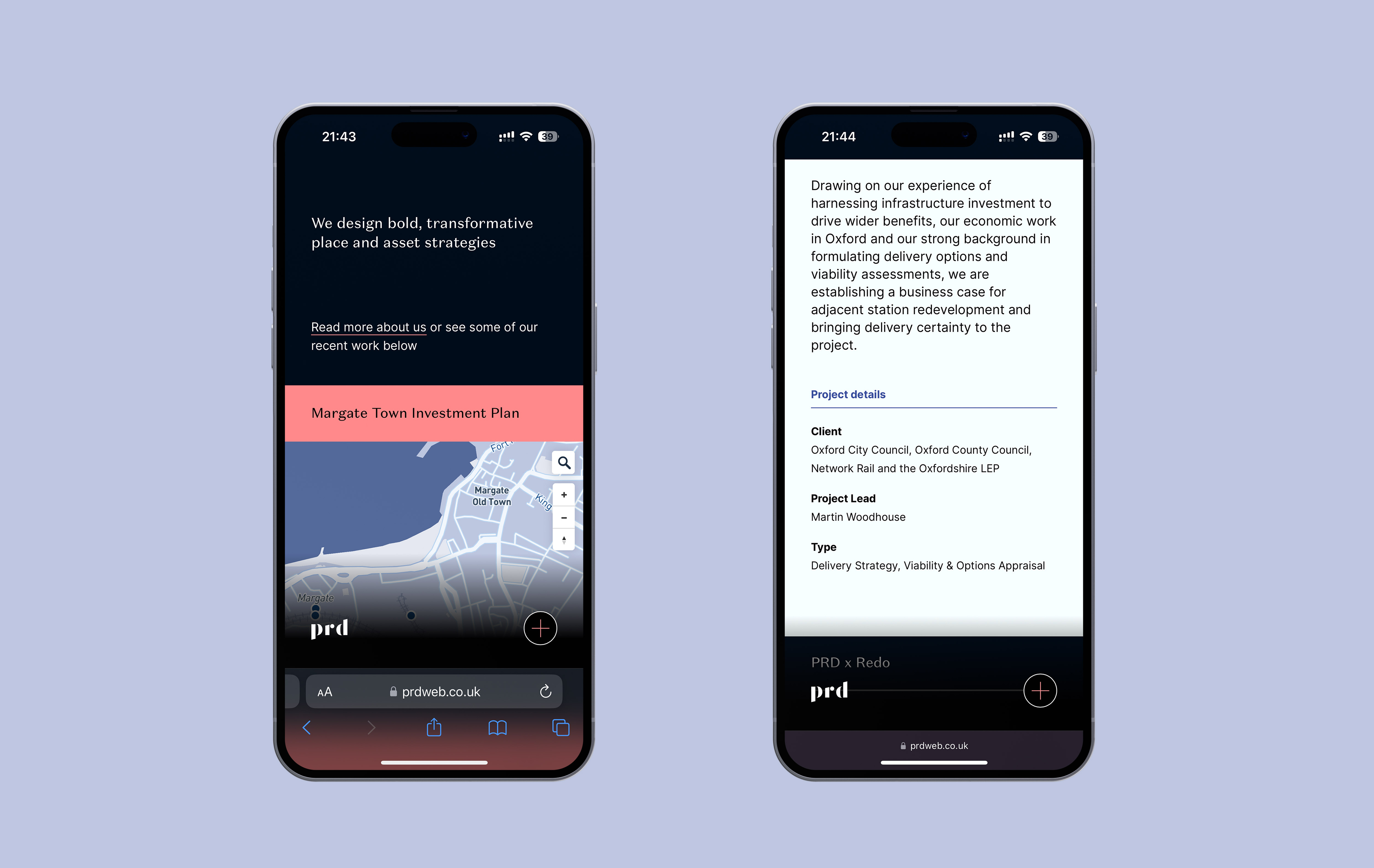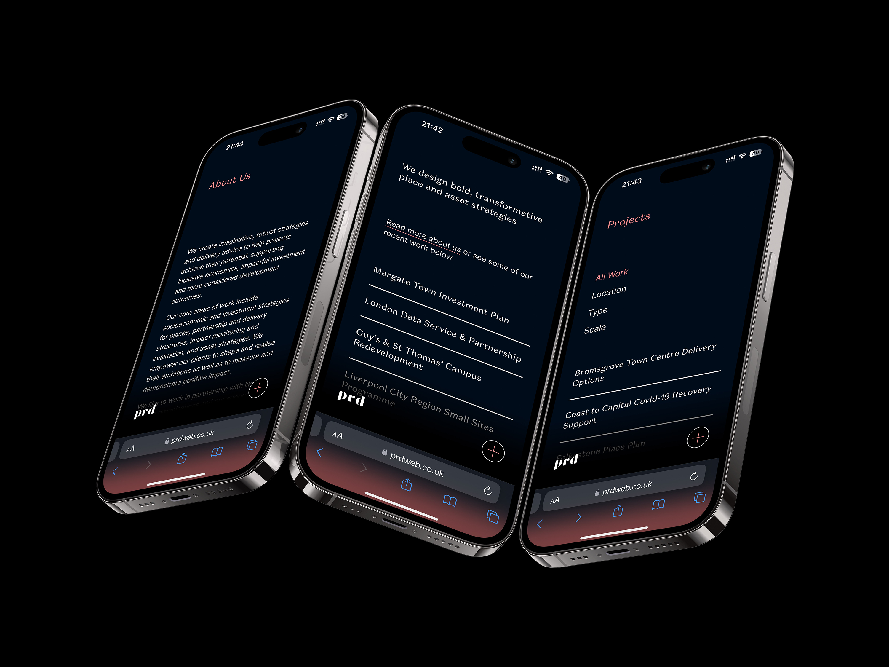 Working collaboratively with PRD, I refined their colour palette and typography. We used Klim Type’s unconventional Domaine Sans Text for the headers and Rasmus Andersson’s ubiquitous Inter for long-form copy. Combining a solid grid system, accessible colours, and carefully crafted typography, the website is optimised for comfortable reading, even without a typical “showcase website” layout. Each project they work on is specific to a “place,” so we used a MapBox API to customise the colour scheme to work alongside the website UI. The design was crafted for seamless experiences on mobile and desktop.