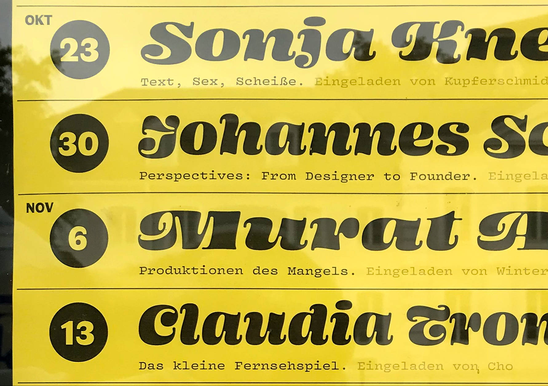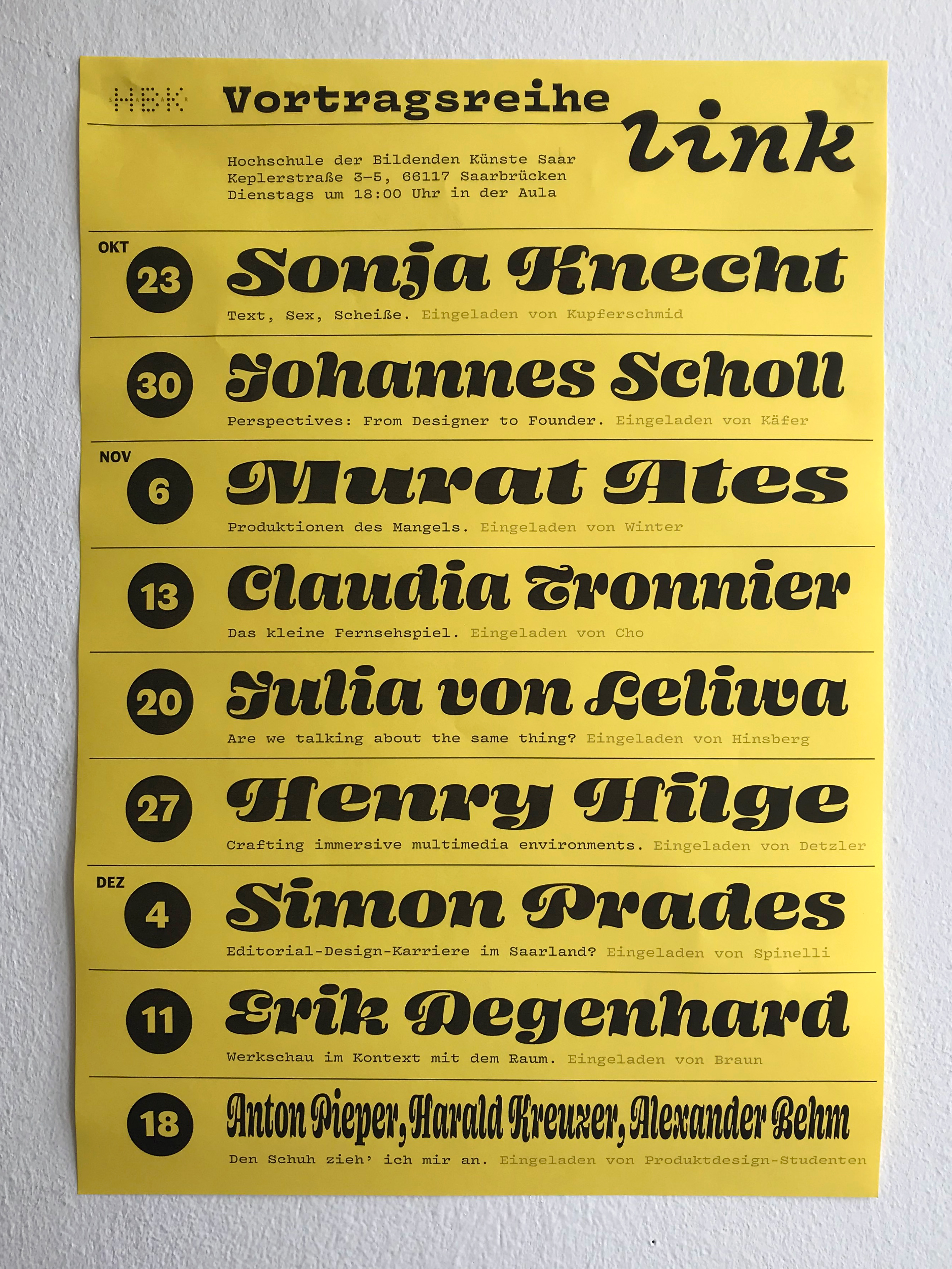 For this poster announcing a series of lecture at HBKsaar, Indra Kupferschmid paired two typefaces by James Edmondson and one by Alice Savoie.