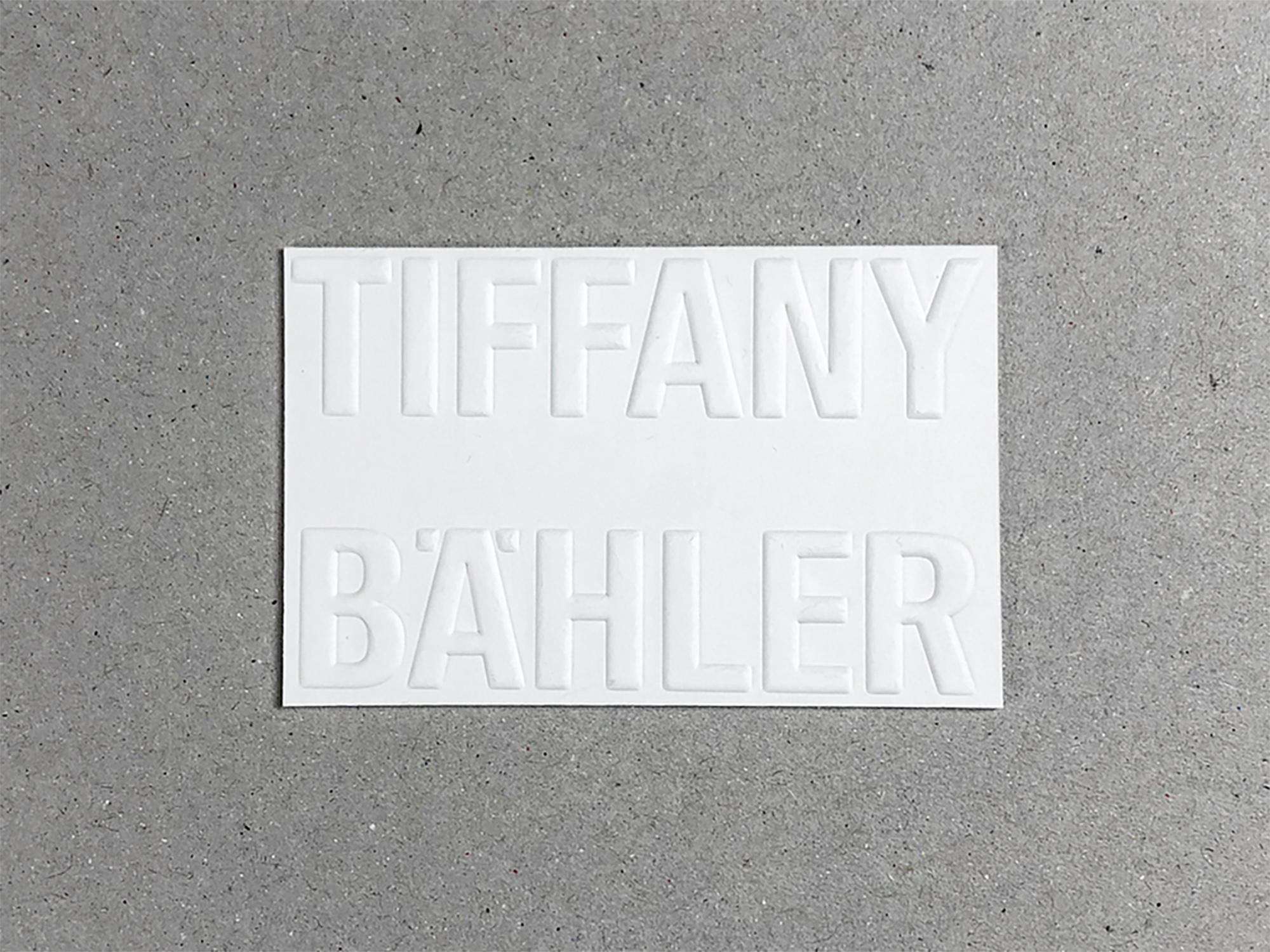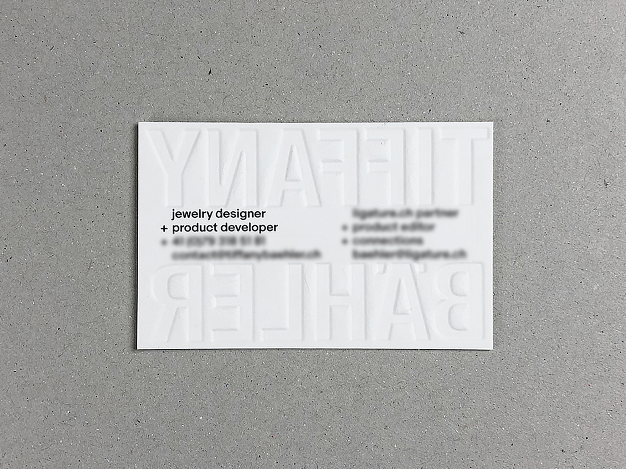 Business card designed for the jewellery designer and teacher Tiffany Bähler. The umlaut on the Ä is a custom design. Blind embossed and printed by letterpress technique on a heavy cotton paper (made in Switzerland). Tiffany’s address details are blurred on her request — they are perfectly visible on the actual cards.