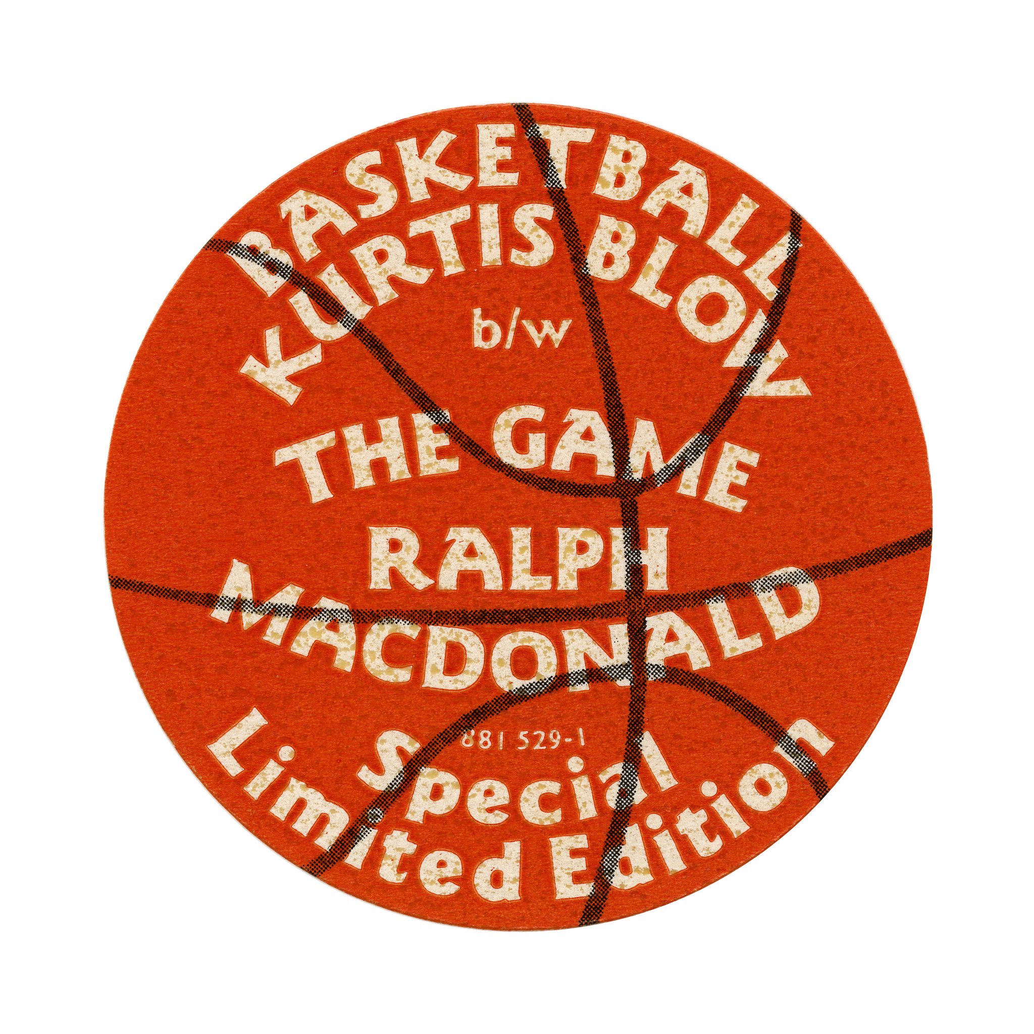 A basketball-shaped sticker printed for a special limited edition of the split single featuring Kurtis Blow’s “Basketball” and Ralph MacDonald’s “(It’s) The Game”, originally released in 1984. This edition must have been released in 1986 or later. The font in use is ITC Goudy Sans Heavy, which was introduced in U&lc magazine Vol. 13, Number 1 from May 1986.