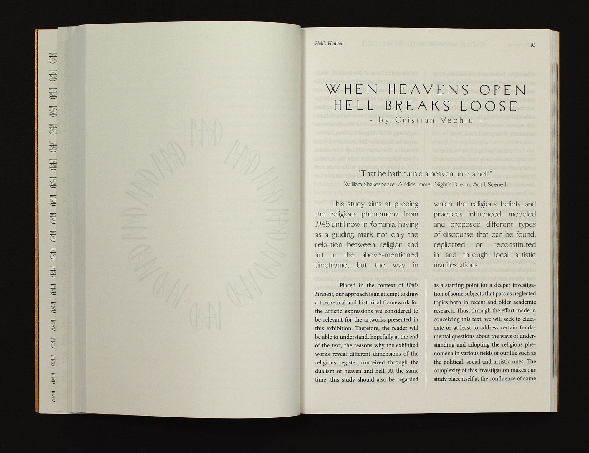 The exhibition tackles religion and unique points of view in recent art here in Romania. My approach was expressing heaven and Hell (Rai and Iad) as the two poles around which artists had gravitated, most of the times finding blends, or gray areas between the two. My perspective was inevitably drawn to the duality of these two opposite poles, the subjectivity of each seen from different points of view, and how in the end they are one entity with two sides, creating and encircling a world.