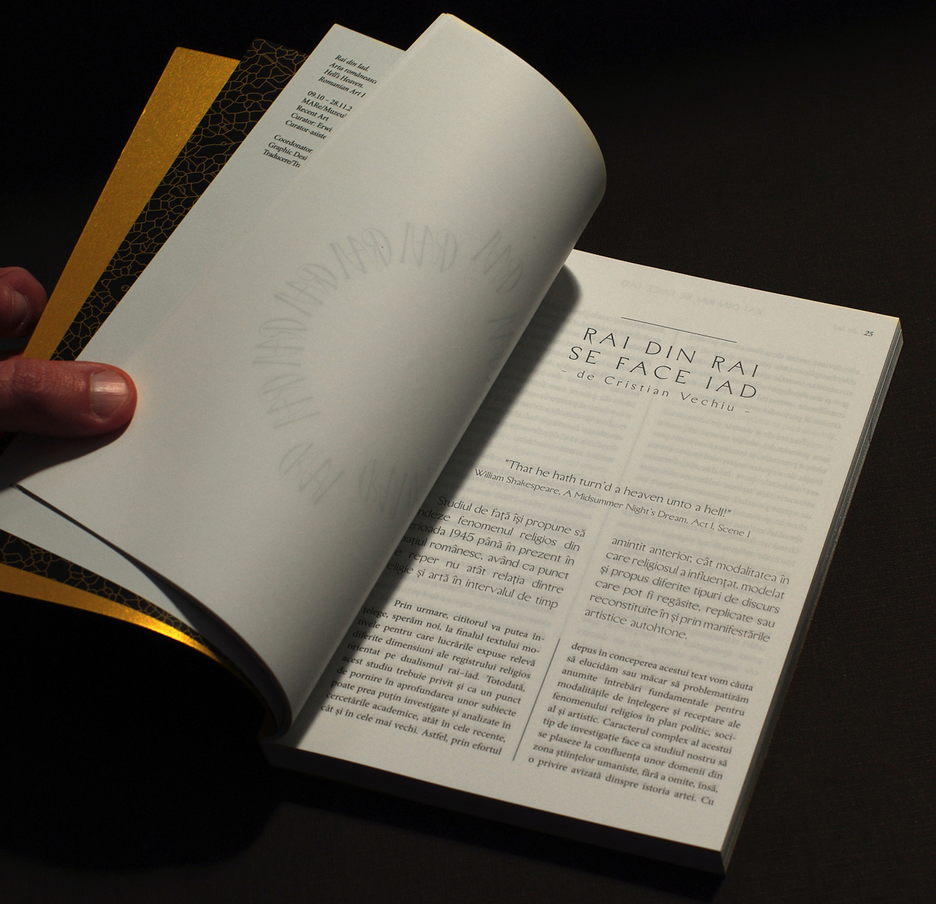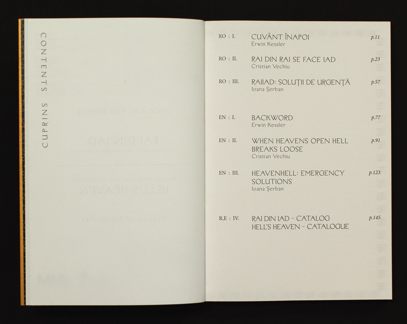RAI din IAD (literal translation: HEAVEN from HELL, official translation: HELL’S HEAVEN) is one of three exhibitions organized for the official opening of the first private museum in Romania in 80 years — the Muzeul de Artă Recentă, or Museum of Recent Art (MARe). I had the pleasure of working on its visual identity, comprising a key visual, a catalogue, as well as graphics for the website, for which I chose to do animation accompanied by a textured sound.