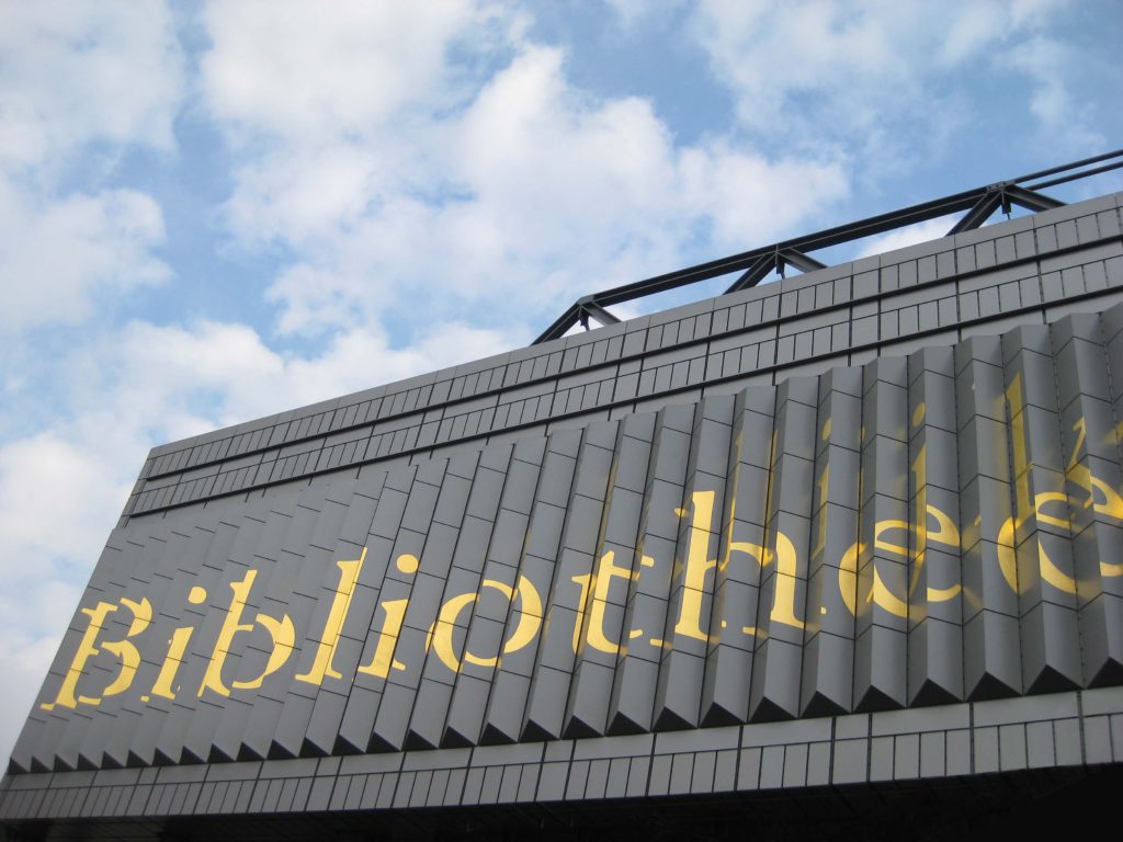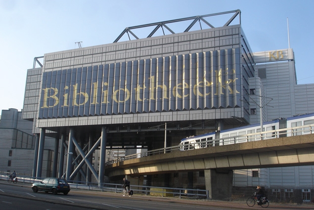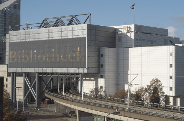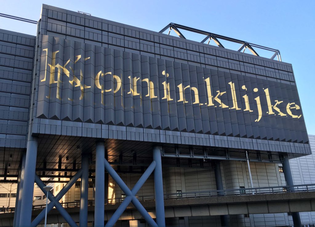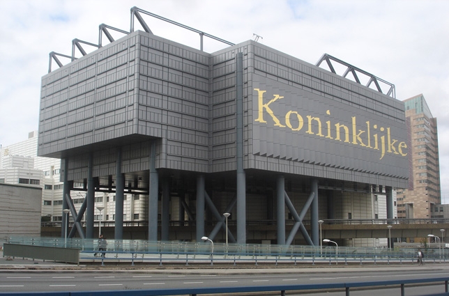 Sign for the Koninklijke Bibliotheek in Den Haag. Two huge words, “Koninklijke” (Royal) and “Bibliotheek” (Library), are set in one of the library’s two corporate typefaces – Garamond Premier – and applied to the triangular panels that shape the façade of the depot of the library, facing one of the city centre’s main gateways.