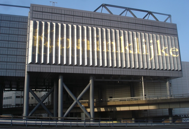 Altogether, the gold leaf used for this signage weigh hardly more than a packet of butter. Yet these enormous letters have been decisive for the shape of the façade panels. That was possible because architect Herbert van der Brugghen and I collaborated from the very first moment on the new construction for the Koninklijke Bibliotheek. Logistics was a complicated job. At Royal Eijsbouts in Brabant the gold was applied to the panels. The panels were transported hanging because otherwise the gold leaf on the corners would be damaged. At the construction site, the parts had to be indicated in the correct order. The people on the jetty could not see if they placed the correct letter fragment (they were too close to have an overview). From the one side, ‘Koninklijke’ is readable, from the other side ‘Bibliotheek’. The most exciting image is visible when you are in the middle, where the intertwined letters create a beautiful abstraction.