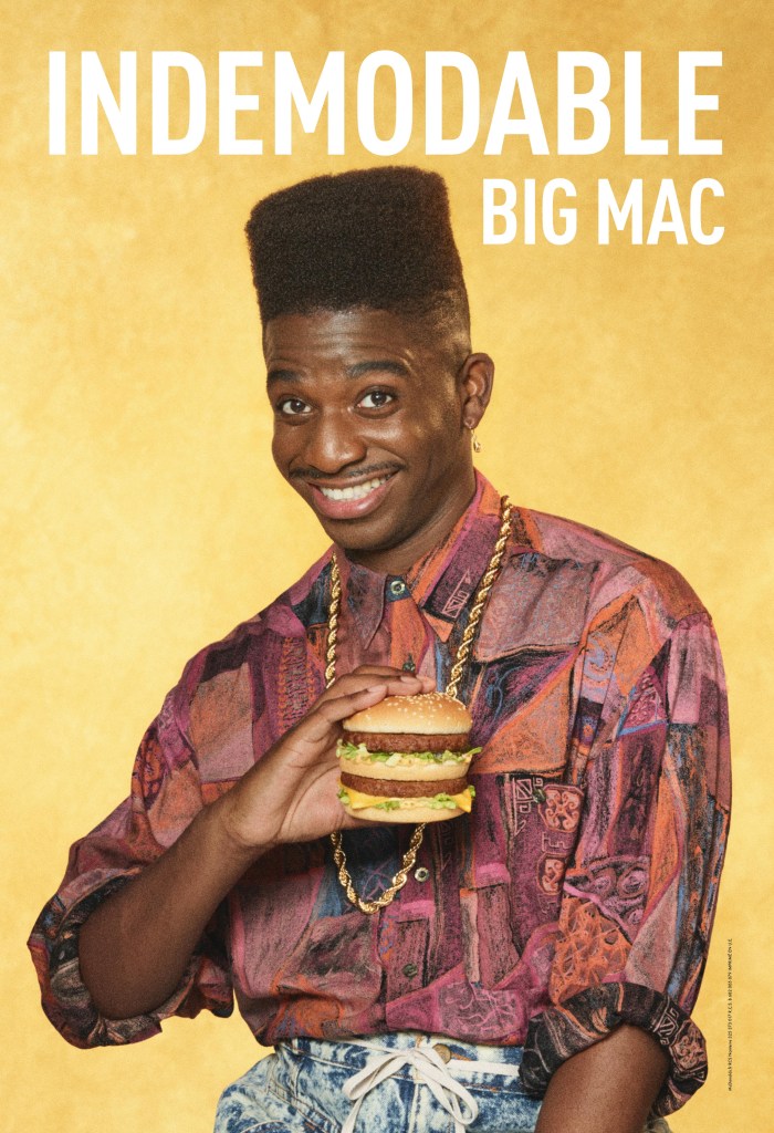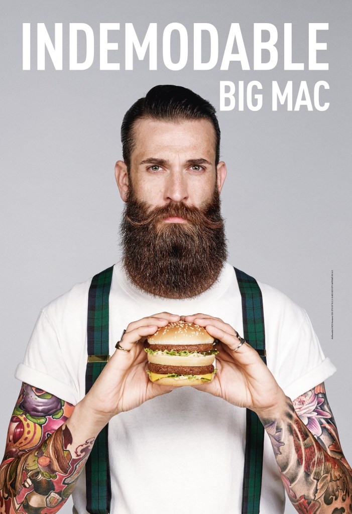 Each of those photos show a Big Mac, but there is no logotype or brand to be seen. The slogan is always “Indemodable Big Mac” [note the missing accent aigu in Indémodable]. The text is set in all-caps FF DIN Condensed Black, with ‘Big Mac’ smaller than ‘Indemodable’ (which means “Timeless” in English). I suppose that, by hiding the logo of the brand and making ‘Indemodable’ such a big word, the goal is to make the Big Mac a common word and not a proper name as if it was a heritage product. This may be caused by the fact that in France McDonald’s is no longer the only fast-food burger brand, there are more and more concurrents.