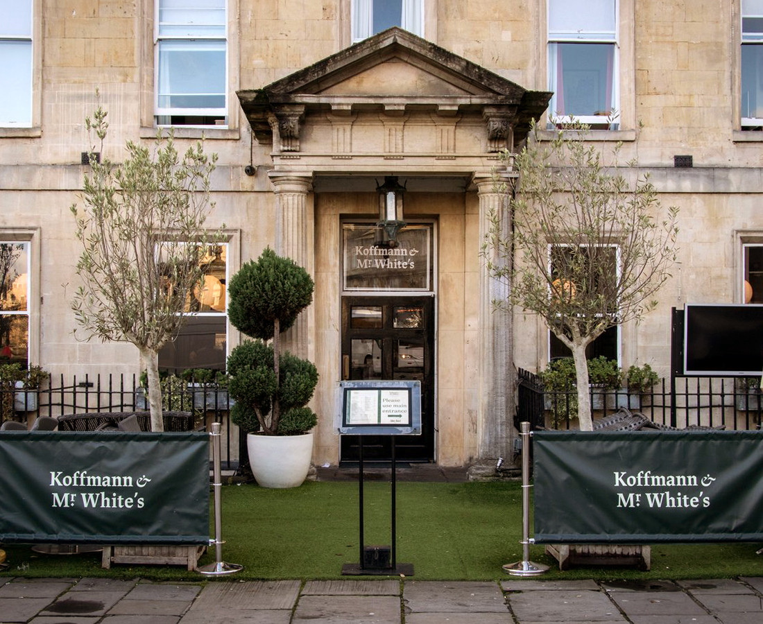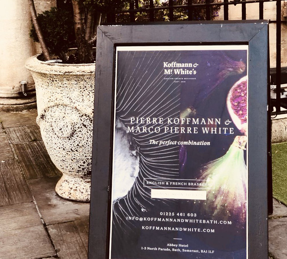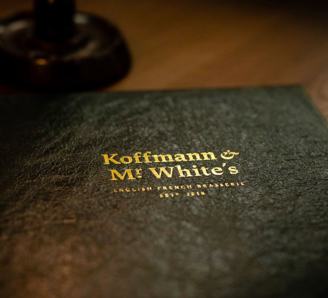 Koffmann and Mr White’s, the new French English brasserie at the Abbey Hotel in Bath, uses JAF Lapture for its identity. The italic ampersand is borrowed from Dala Floda.