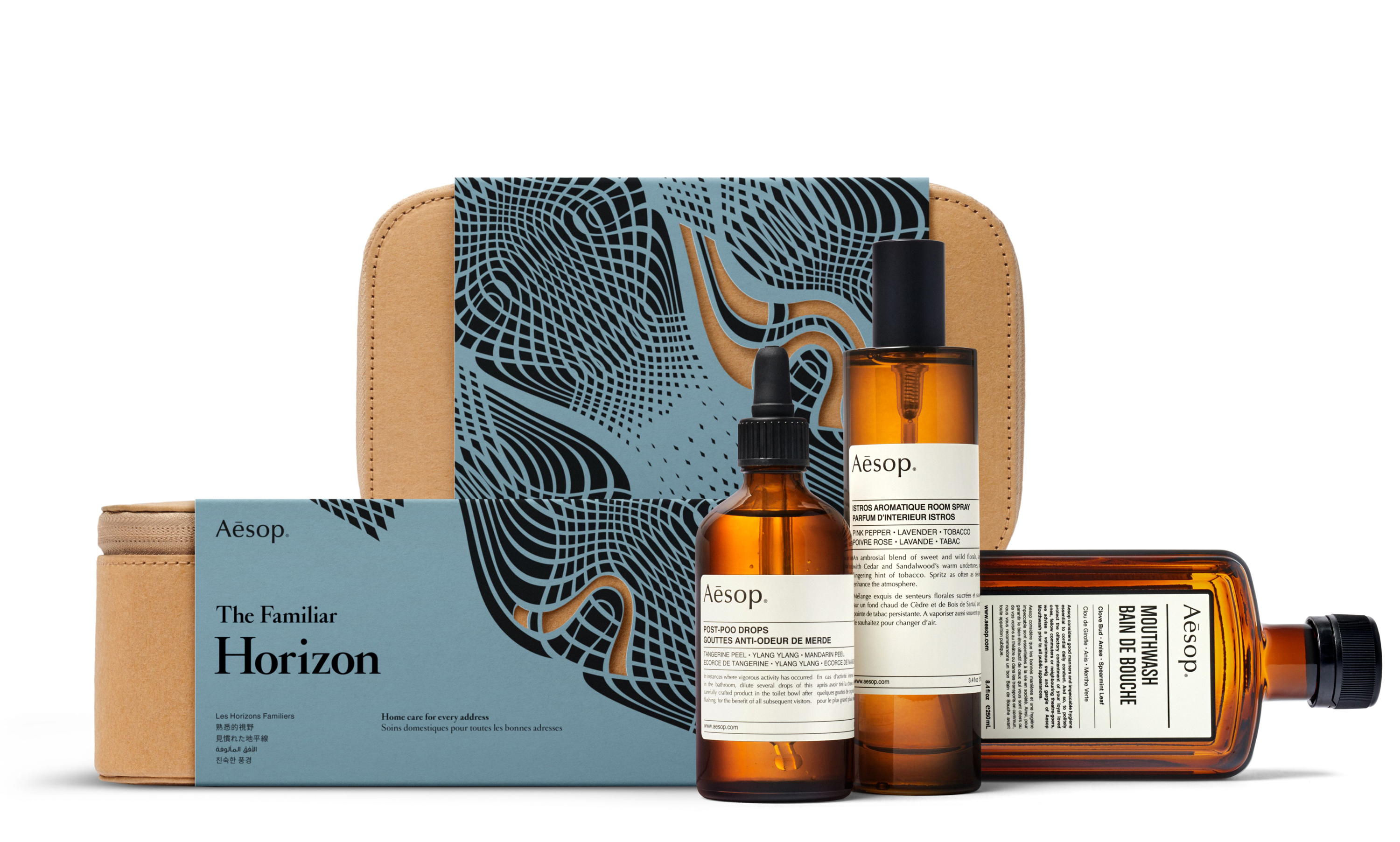 The elegant serif is used for the names – A Curious Connection, Contours of Discovery, The Familiar Horizon, Orbit of Intention – with the last of the three words shown at a larger size. The English and French description lines are set in two weights from Cardinal Classic Mid. Cardinal is paired with Aēsop’s standard typefaces, Optima and Neue Helvetica.