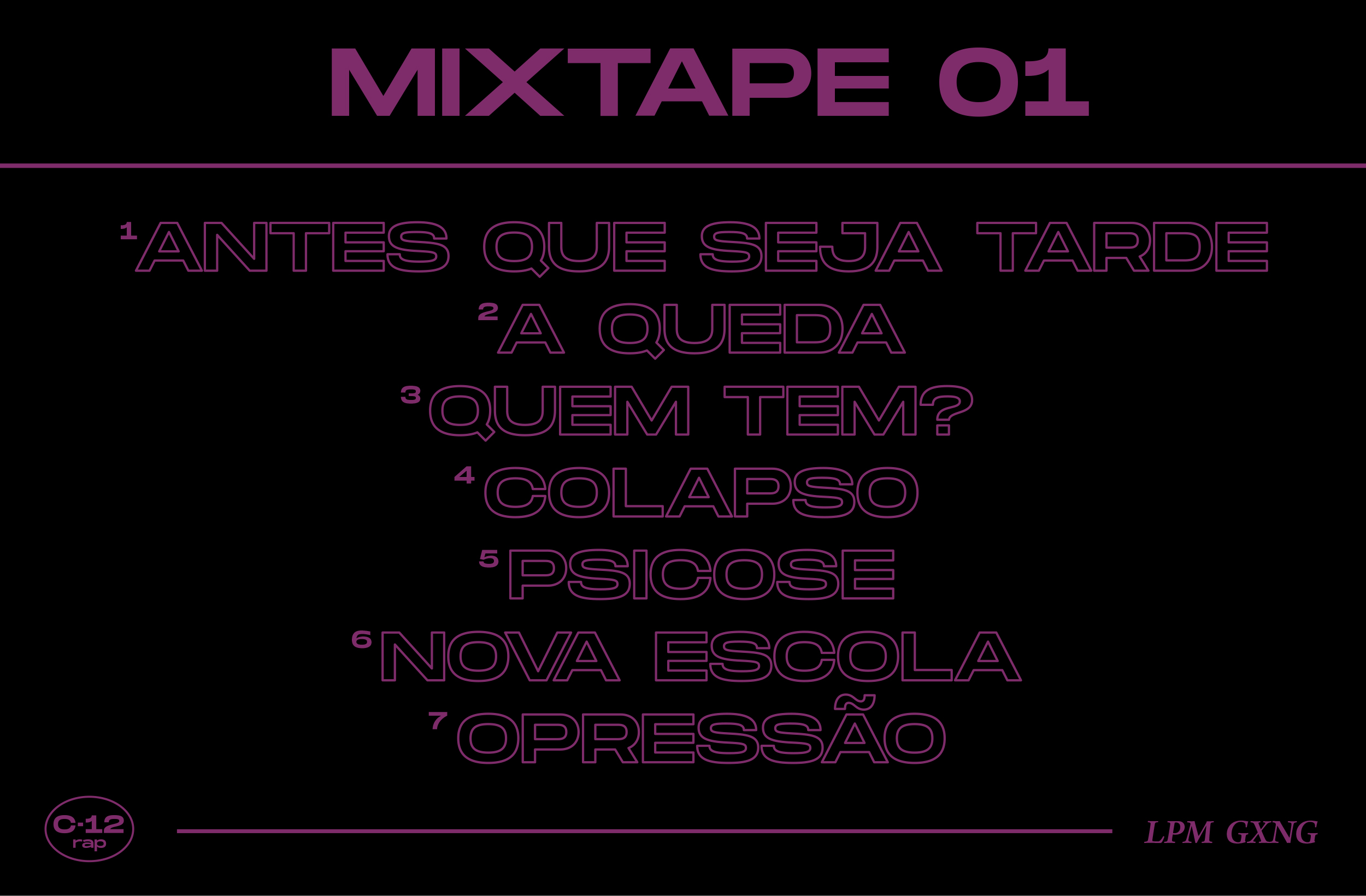 Marca e Identidade Visual para o grupo de rap C12. Foram desenvolvidos cartazes, peças de roupa, capas para disco, acessórios, entre outros. O objetivo do projeto é melhorar a comunicação do grupo com o público, trazendo um visual contemporâneo e aumentando sua visibilidade.