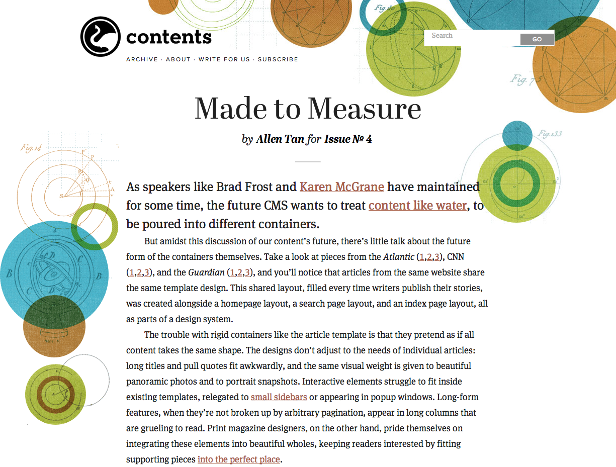 Contents is an online magazine for readers who create, edit, publish, analyze, and care for the contents of the internet. We publish in open, themed issues that run for about eight weeks. When we’re publishing an issue, a new article appears most Wednesdays.